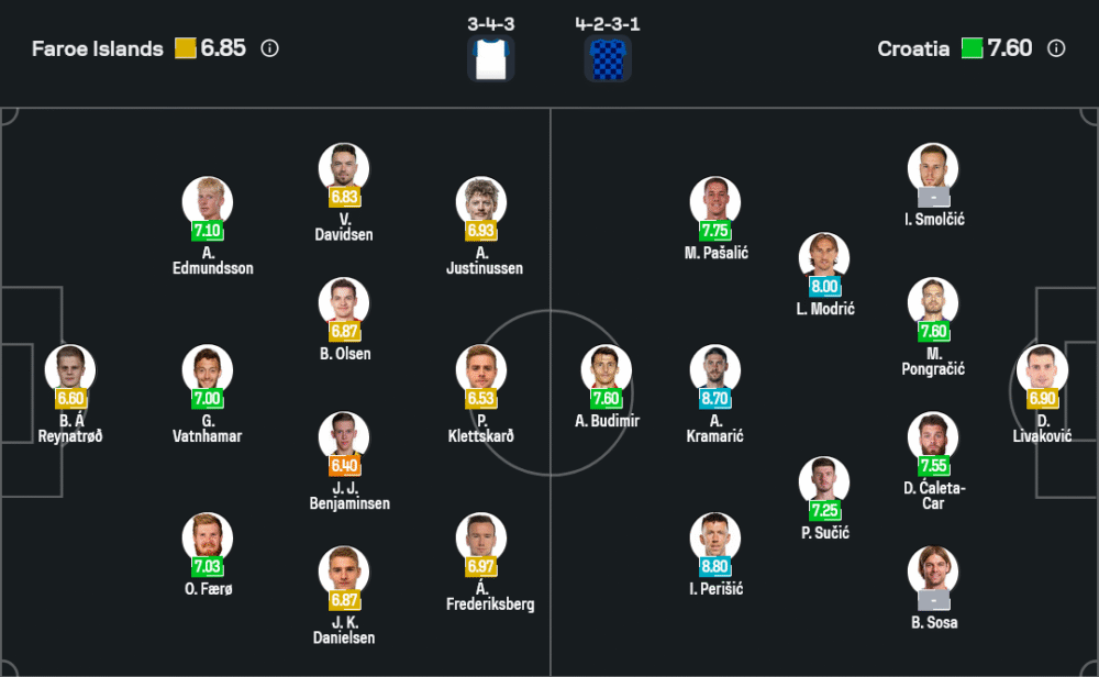 อียูน คลาคสไตน์ เรียกแข้งหลักมาติดครบขบวน แม้จะไร้ เรเน่ โยเอนเซ่น กับ ซามูเอล ชุควูดี้ ที่ยังเดี้ยง แต่โครงสร้างทีมยังคงระบบ 3-4-3 แบบออริจินอล นายด่านเป็น มัตเตียส ลามเฮาเก้ แผงหลังใช้ อันเดรียส เอ็ดมุนดส์สัน, กุนน่าร์ วัตน์ฮามาร์ และ อ็อดมาร์ แฟโร เป็นสามเซ็นเตอร์ ด้านปีกวิงสองฝั่ง โยแอนเนส ดาเนียลสัน กับ วิลยอร์มูร์ ดาวิดเซ่น ทำหน้าที่ขึ้นลงแบบไม่มีพัก คู่กลางฮาร์ดแมน ฮัลลูร์ ฮานส์สัน จับคู่ บรันดูร์ เฮนดริคส์สัน คอยตัด-จ่าย สวนกลับให้แนวรุกสามตัว อาร์นี่ เฟรเดริคส์เบิร์ก, พัลล์ เคลตต์สคาร์ด และ อาเดรียน ยุสตินุสเซ่น ที่พร้อมกระชากใส่หลังไลน์โครแอต