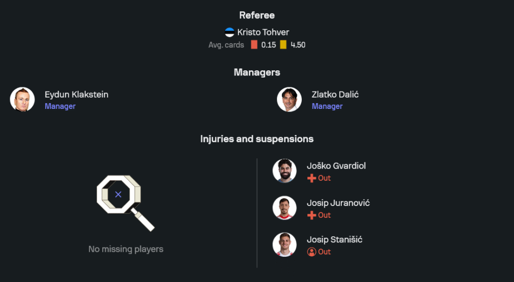 ซลัตโก้ ดาลิช ยังคงทรงบอลคอนโทรล เกมรับแน่น-เกมรุกคม แม้ขาดสามขุนพลสำคัญอย่าง ยอสโก้ กวาร์ดิโอล, โยซิป ยูราโนวิช และ โยซิป สตานิซิช จากอาการบาดเจ็บ แต่โครงทีมยังเต็มไปด้วยสตาร์ นายประตู โดมินิค ลิวาโควิช ยืนหนึ่ง แผงหลังจัด โยซิป ซูตาโล่ จับคู่ ดูเย่ ชาเลต้า-คาร์ โดยมี บอร์น่า โซซ่า เติมซ้าย กลางสองวางตำนานมีชีวิต ลูก้า โมดริช คุมจังหวะร่วม เปต้าร์ ซูซิช แถวบนให้ อันเดรย์ ครามาริช กับ มาริโอ ปาซาลิช ทำเกมขนาบข้าง อิวาน เปริซิช และหน้าเป้าใช้ ฟรังโย่ อิวาโนวิช หรือ อันเต้ บูดิมีร์ แล้วแต่หมากที่กุนซือจะเลือกเปิดหน้าใส่