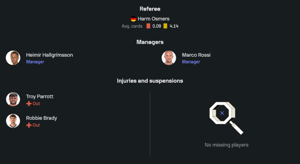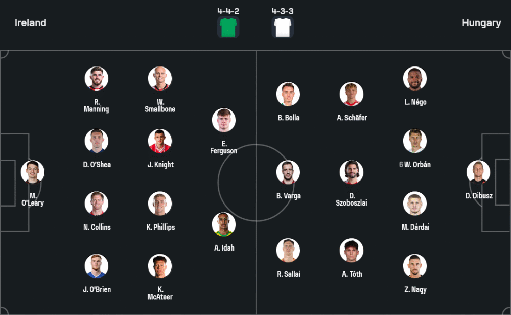 ภาพจากไลน์อัปล่าสุดสะท้อนแนวทางที่ ไฮเมียร์ ฮัลล์กริมสสัน ยึด 4-4-2 ที่กระชับและดุดัน เกมนี้เจ้าบ้านขาดสองตัวรุกประสบการณ์อย่าง ทรอย แพร์ร็อตต์ และ ร็อบบี้ เบรดี้ (ต่าง “Out” ตามรายงานก่อนเกม) แต่ตัวแกนหลักพร้อมลุย แผงหลังใช้ นาธาน คอลลินส์ ยืนคุมจังหวะคู่ เควิน ฟิลลิปส์ โดยมีแบ็กสองฝั่ง เจมส์ โอไบรอัน กับ ไรอัน แมนนิ่ง เติมเกมดุดัน กลางคู่รับ–รุก เจสัน ไนท์ ผนึก วิลล์ สมอลล์โบน คอยเชื่อมออกปีก เคซี่ย์ แมคอาเทียร์ กับ ไมกี้ จอห์นสตัน เพื่อเปิดทางให้คู่หัวหอก อดัม ไอดาห์ ที่ความเร็วและพลังชนคืออาวุธ ร่วมกับ อีแวน เฟอร์กูสัน ดาวยิงวัยคะนองที่เล่นบอลหนึ่งจังหวะได้เฉียบ น่าเชื่อว่า ไอร์แลนด์ จะยกเพรสซิ่งระดับกลางขึ้นสูงเป็นช่วงๆ เพื่อบีบให้แนวรับฮังการีผิดพลาดก่อนสวนระยะสั้นเข้าใจกลาง