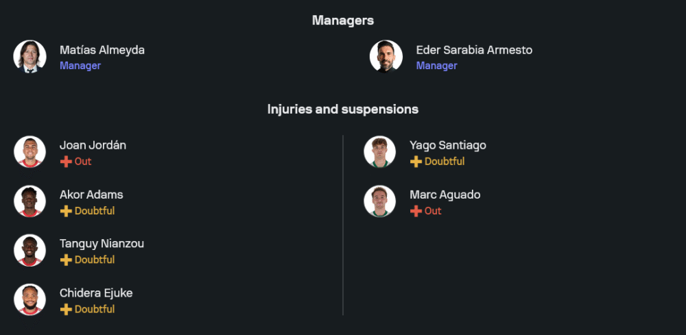 ภายใต้การคุมทีมของ มาตีอัส อัลเมย์ดา ผลงานออกสตาร์ทไม่ดีนัก ชนะเพียง 1 จาก 3 เกมลีกแรก สภาพทีมวันนี้มีปัญหาไม่น้อย เนื่องจาก โฆอัน จอร์ดาน เจ็บยาวชวดแน่นอน ส่วน ต็องกีย์ นิอองซู, อากอร์ อดัม และ ชิเดร่า เอจูเก้ ต้องรอเช็กความฟิต การจัดทัพคาดว่าจะใช้ระบบ 4-2-3-1 แนวรุกวาง รูเบน วาร์กาส, อัลฟอน กอนซาเลซ และ ฆวนลู ซานเชซ สนับสนุนหัวหอกตัวเป้า อิสซัก โรเมโร่ ที่พร้อมทะลวงตาข่าย