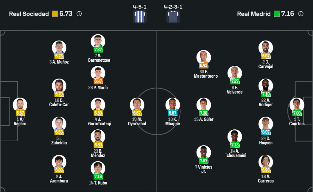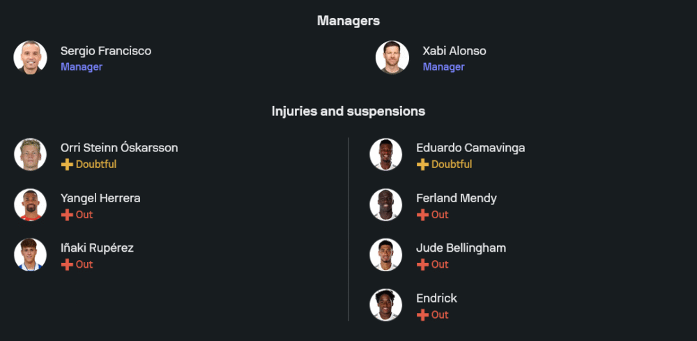 ทางฝั่งผู้มาเยือนของ ชาบี อลอนโซ่ แม้จะมีปัญหานักเตะเจ็บเช่นกัน ไม่ว่าจะเป็น จู๊ด เบลลิ่งแฮม, เอ็นดริค และแฟร์กล็อง เมนดี้ แต่ทัพหลักยังคงอัดแน่นด้วยสตาร์ระดับโลกอย่าง คิเลียน เอ็มบัปเป้, วินิซิอุส จูเนียร์ และ เฟเดริโก้ บัลเบร์เด้ พร้อมด้วย อาร์ดา กูเลอร์ ที่ฟอร์มกำลังพุ่งแรง แผงหลังยังคงแข็งโป๊กนำโดย อันโตนิโอ รือดิเกอร์ และนายด่านมือหนึ่ง ติโบต์ กูร์กตัวส์