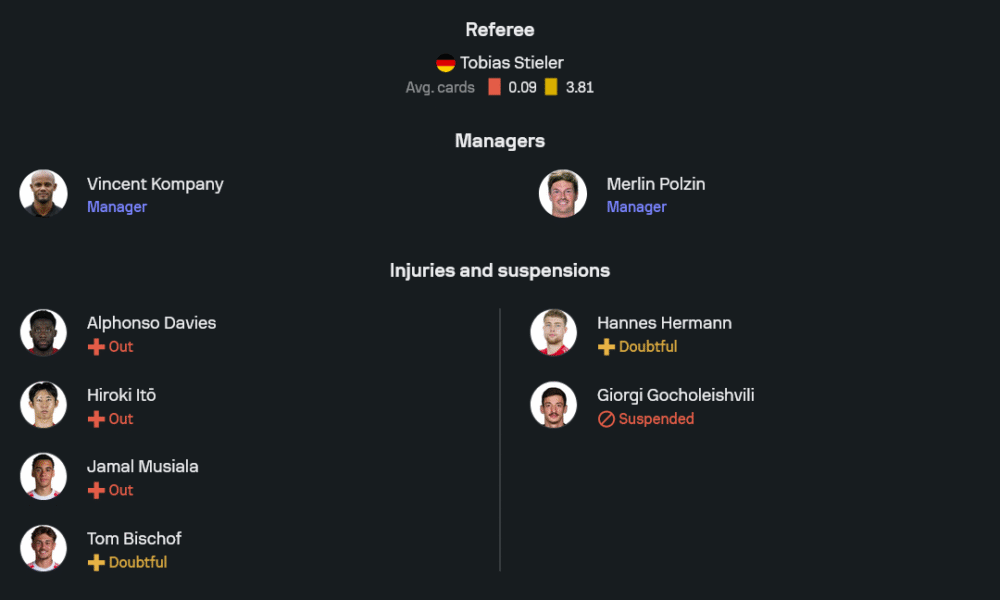 วินเซนต์ กอมปานี นายใหญ่ของบาเยิร์นยังต้องเจอกับปัญหานักเตะเจ็บหลายราย ทั้ง อัลฟอนโซ่ เดวิส, ฮิโรกิ อิโตะ และ จามาล มูเซียล่า ส่วน ทอม บิสชอฟ ยังต้องรอเช็กความฟิต แต่ภาพรวมขุมกำลังหลักยังอยู่ครบ พร้อมส่ง แฮร์รี่ เคน ที่ซัดไปแล้ว 3 ประตู นำทัพร่วมกับ ไมเคิ่ล โอลิเซ่ ที่ฟอร์มร้อนแรงสุดๆ กดไปแล้ว 3 ลูกเช่นกัน สนับสนุนด้วย เซิร์จ นาบรี้ และ หลุยส์ ดิอ๊าซ