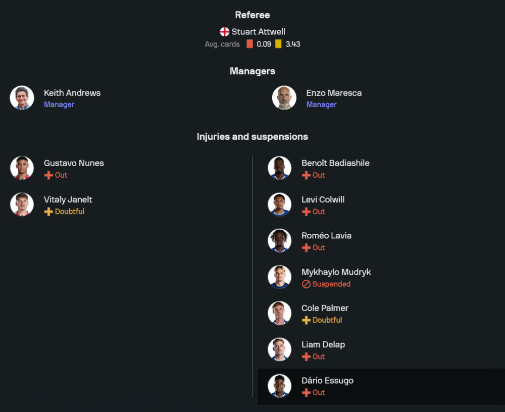 ฝั่งทีมเยือนของ เอนโซ่ มาเรสก้า ต้องขาดผู้เล่นชุดใหญ่เพียบ ทั้ง เลวี่ โคลวิลล์, เบอนัวต์ บาเดียชิล, โรเมโอ ลาเวีย, โคล พัลเมอร์, เลียม ดีแล็ป และ ดาริโอ เอสซูโก้ โดยทั้งหมดเจ็บยาวหรือยังไม่พร้อมลงสนาม แถม มิโคไฮโล มูดริค ติดโทษแบนเพิ่มอีกหนึ่ง แต่ขุมกำลังที่เหลือยังถือว่าพร้อมเต็มพิกัด คีย์แมนในแดนกลางคือ มอยเซส ไกเซโด้ คอยตัดเกมและเชื่อมต่อร่วมกับ เอ็นโซ่ เฟร์นานเดซ เกมรุกฝากความหวังไว้ที่ เอสเตเวา, เชา เปโดร และ เปโดร เนโต้ ส่วนหน้าเป้าจะใช้ มาร์ก กียู ยืนค้ำแดนบนในระบบ 4-2-3-1