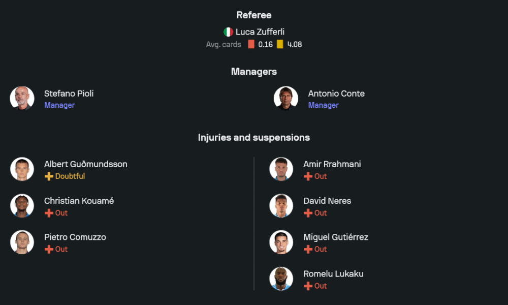 ปิโอลี่เจอปัญหาขุมกำลังแนวรุกหดหาย อัลเบิร์ต กุดมุนด์สสัน เจ็บข้อเท้าและยังต้องลุ้นอีกเฮือก ขณะที่ คริสติย็อง คูอาเม และ ปีเอโตร โคมุซโซ ยังเดี้ยงยาว แต่ข่าวดีคือโครงสร้างเกมรับเริ่มลงล็อก ดาบิด เด เคอา พร้อมยืนเฝ้าเสา แผงหลังสามคน มาริน ปอนกราชิช คุมจุดศูนย์กลางร่วมกับ ลูก้า รานิเอรี่ ส่วนวิงแบ็กซ้าย–ขวาใช้ โรบิน โกเซ่นส์ กับ โดโด้ คอยดันสูงสร้างความกดดัน กลางสนาม โรลันโด้ มันดราโกร่า ผนึกกำลังกับ ฮันส์ นิโคลุสซี่ คาบีเกลีย จัดระเบียบเกมและไล่กัดบอล ทางรุกอาจให้ มอยเซ่ คีน ยืนคู่ โรแบร์โต้ ปิคโคลี ในระบบ 3-4-1-2 หรือ 3-5-2 ตามจังหวะเกมเพื่อเล่นงานระยะประชิด
