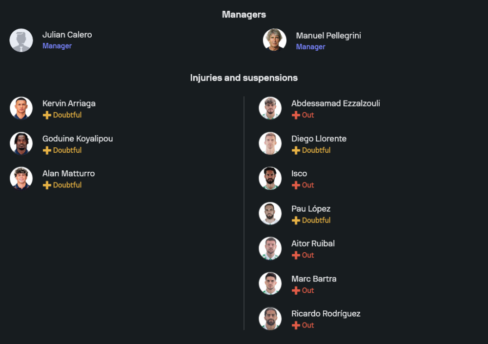 ฝั่งทีมเยือนของ Manuel Pellegrini ฟอร์มยังไม่นิ่ง หลังจากพ่ายคาบ้านต่อ บิลเบา ล่าสุด สภาพทีมเจ็บเพียบทั้ง Isco, Aitor Ruibal, Ricardo Rodríguez และ Ez Abde ส่วน Pau López กับ Diego Llorente ต้องเช็กความฟิต แต่ข่าวดีคือมี Antony แนวรุกริมเส้นที่หายเจ็บกลับมา ประสานงานกับ Lo Celso และ Riquelme ด้านหน้า ส่วนหอกเป้ายังคงเป็น Cucho Hernández
