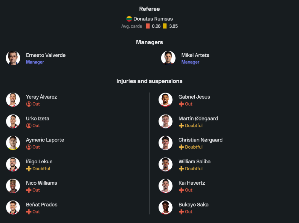 ฝั่งทีมเยือนของ มิเกล อาร์เตต้า เจอปัญหาไม่น้อยเช่นกันเมื่อขาดแกนหลักหลายราย กาเบรียล เฮซุส, ไค ฮาเวิร์ตซ์ และ บูกาโย่ ซาก้า หมดสิทธิ์ลงเล่นแน่นอน ขณะที่ มาร์ติน โอเดการ์ด, คริสเตียน นอร์การ์ด และ วิลเลี่ยม ซาลิบา ยังต้องรอทดสอบความฟิต แต่ในแผงกลางยังมี ดีแคลน ไรซ์ คอยบัญชาเกม โดยจะร่วมกับ มาร์ติน ซูบิเมนดี้ และ มิเกล เมริโน่ ส่วนแนวรุกส่ง โน่นี่ มาดูเอเก้, วิคตอร์ โยเคเรส และ เอเบเรชี่ เอเซ่ ลงป่วนแนวรับคู่แข่งในระบบ 4-3-3