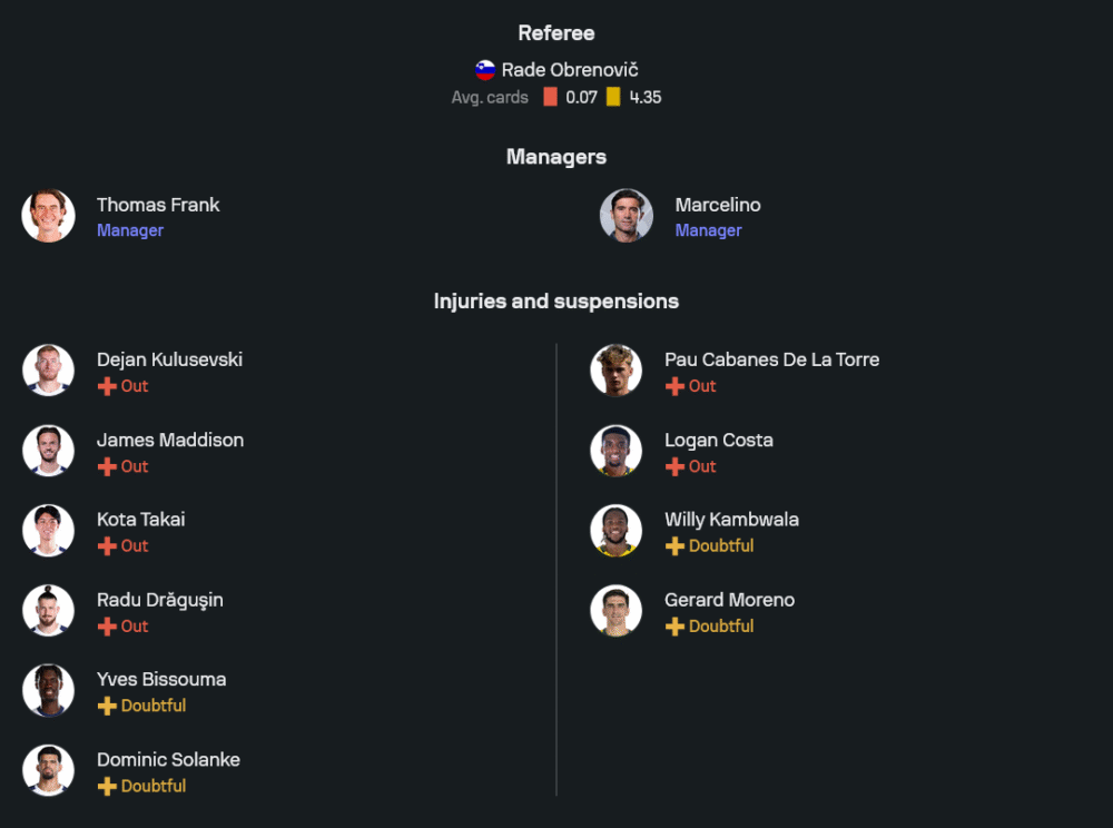 โธมัส แฟรงก์ กุนซือใหม่พาทีมออกสตาร์ทได้อย่างเร้าใจ เกมลีกนัดล่าสุดกดเวสต์แฮมขาดลอย 3-0 พร้อมรักษาคลีนชีตต่อเนื่อง สามประตูได้มาจากการยิงของ ปาเป้ ซาร์, ลูคัส เบิร์กวัลล์ และ มิคกี้ ฟาน เดอ เฟน ขุมกำลังยังคงมีปัญหาตัวเจ็บหลายราย ไม่ว่าจะเป็น เดยัน คูลูเซฟสกี้, เจมส์ แมดดิสัน, โคตะ ทาคาอิ, ราดู ดรากูซิน รวมถึง โดมินิค โซลันกี้ ที่ยังต้องรอเช็กฟิต เช่นเดียวกับ อีฟส์ บิสซูม่า ที่มีอาการเจ็บรบกวน แต่แนวรุกยังมีทีเด็ดอย่าง ริชาร์ลิซอน, ซาบี ซิมอนส์ และ โมฮัมเหม็ด คูดุส พร้อมสร้างความปั่นป่วนให้แนวรับทีมเยือน