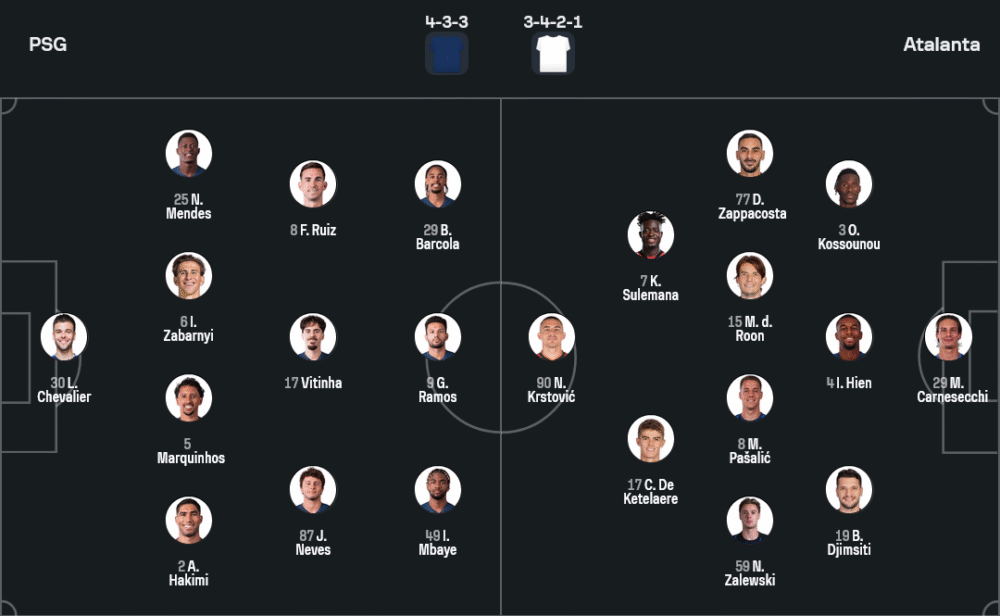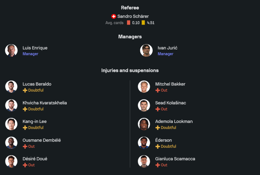 ข้อมูลจากภาพไลน์อัพยืนยันชัด หลุยส์ เอ็นรีเก้ ต้องบริหารทีมท่ามกลางปัญหาแนวรุกเจ็บหลายราย อุสมาน เดมเบเล่ และ เดซิเร่ ดูเอ้ หมดสิทธิ์ ส่วน ลูคัส เบรัลโด้, ควิช่า ควารัตสเคเลีย และ ลี คัง-อิน อยู่ในกลุ่มต้องเช็กความฟิต อย่างไรก็ดี 11 ตัวจริงยังแน่นด้วยระบบ 4-3-3 ผู้รักษาประตูเป็น ลูก้าส์ เชวาลิเย่ร์ แผงหลังเรียงจากขวาไปซ้าย อาชราฟ ฮาคิมี่, มาร์คินญอส จับคู่ อิลย่า ซาบาร์นีย์ แล้วมี นูโน่ เมนเดส ยืนซ้าย กลางสามใช้ เจา เนเวส เชื่อมเกมร่วมกับ วิตินญ่า และ ฟาเบียน รุยซ์ ส่วนแนวรุกฝากความคมไว้ที่ แบร๊ดลีย์ บาร์โคล่า กับ อิบราฮิม เอ็มบาย ขนาบข้างหน้าเป้า กอนซาโล่ รามอส