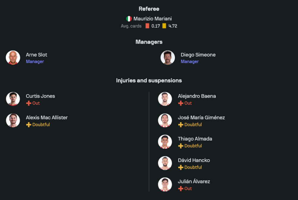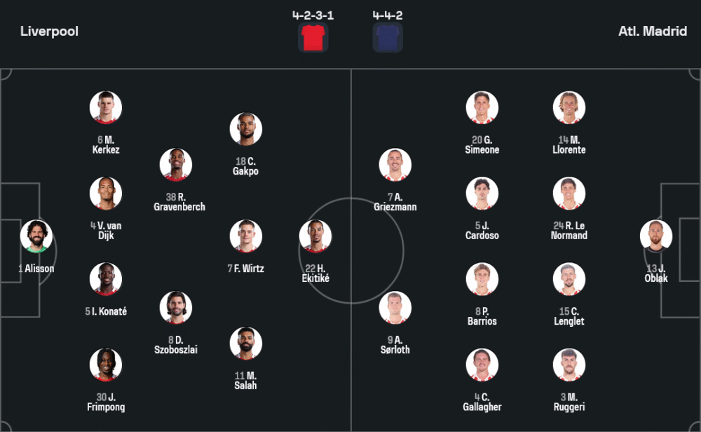 ตามข้อมูลจากภาพประกอบ โค้ชอาร์เน่ สล็อต ต้องขาด เคอร์ติส โจนส์ ที่เจ็บยาว และรอเช็คฟิต อเล็กซิส แม็ค อัลลิสเตอร์ แต่ขุมกำลังหลักส่วนใหญ่พร้อมรบ แผนที่คาดคือ 4-2-3-1 มี อลิสซง เบ็คเกอร์ ยืนเฝ้าเสา คู่เซ็นเตอร์เป็น อิบราฮิม่า โกนาเต้ กับ เฟอร์กิล ฟาน ไดค์ ขวาเป็นฟูลแบ็กสปีดจัดอย่าง เจเรมี่ ฟริมปอง ซ้ายในภาพใช้ มิลอส เคอร์เกซ เพื่อเติมเกมสูง แดนกลางสองตัวคุมจังหวะด้วย โดมินิค โซโบสไล และ ไรอัน กราเฟนเบิร์ช สามประสานกลางรุกประกอบด้วย โมฮาเหม็ด ซาลาห์ ตัดเข้าในจากขวา ตรงกลางวาง ฟลอเรียน เวียร์ตซ์ ทำเกม และ โคดี้ กั๊คโป ลากเลื้อยทางซ้าย หน้าเป้าใช้ อูโก้ เอกิติเก้ เป็นตัวจบสกอร์ จุดแข็งของชุดนี้คือสปีดบอลในพื้นที่สุดท้ายและการสอดขึ้นมาปิดสกอร์ของบรรดาตัวรุกที่หมุนเปลี่ยนตำแหน่งได้ตลอด