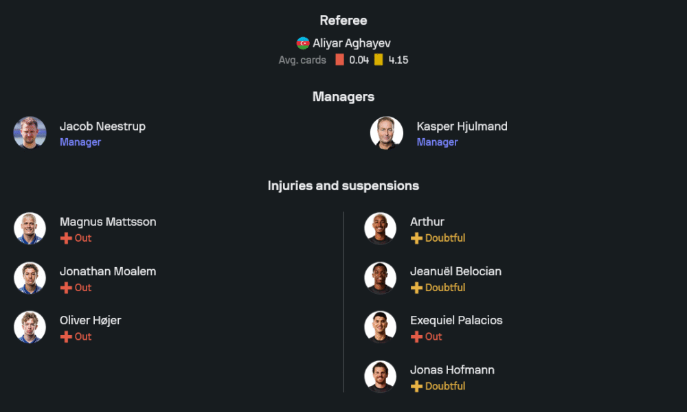 ทีมเยือน “ห้างขายยา” ของกุนซือ แคสเปอร์ ฮยุลมันด์ อดีตโค้ชทีมชาติเดนมาร์ก งานนี้กลับมาเยือนบ้านเกิดในฐานะศัตรู จุดที่น่าเป็นห่วงคือการขาด เอเซเกียล ปาลาซิออส ห้องเครื่องคนสำคัญที่เดี้ยงยาว ขณะที่ โจนาส ฮอฟมันน์, อาร์ตูร์ และ ฌานูเอล เบโลเซียน ยังต้องรอเช็กความฟิต แต่ข่าวดีคือยังมีแกนหลักอยู่ครบ ทั้ง ปาทริค ชิค กองหน้าตัวเก่ง, นาธาน เทลล่า, มาลิค ทิลล์มันน์ และแบ็กจอมบุก อเลฮานโดร กริมัลโด้ พร้อมช่วยทีมเต็มที่