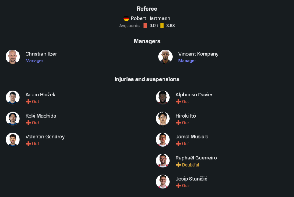 เสือใต้ของ แว็งซ็อง กงปานี ยังโหดสมราคาจ่าฝูง ฟาดชัยรวดทุกนัดทุกรายการตั้งแต่เปิดซีซั่น เกมนี้แม้จะขาด โยซิป สตานิซิช, อัลฟอนโซ่ เดวิส, ฮิโรกิ อิโตะ และ จามาล มูเซียล่า ที่บาดเจ็บ แต่แนวรุกยังเต็มสูบ นำโดย แฮร์รี่ เคน ที่ฟอร์มคมเหมือนเดิม ซัดเบิ้ลในเกมล่าสุด ผนึกกำลังกับ ไมเคิ่ล โอลิเซ่ และ หลุยส์ ดิอาซ ที่กำลังพีคสุดๆ ขณะที่แดนกลางมี โยชัว คิมมิช คอยคุมจังหวะและสั่งการเกม