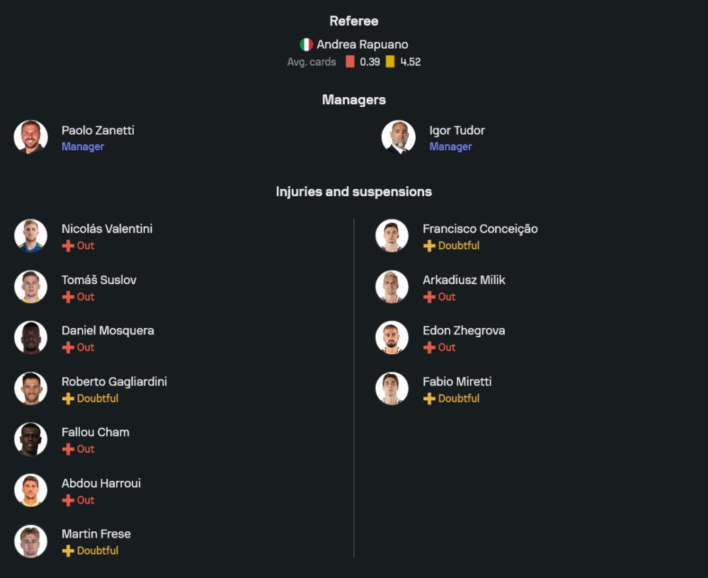 ลูกทีมของ เปาโล ซาเน็ตติ ออกสตาร์ทฤดูกาลนี้ได้ไม่ดีนัก เล่นไป 3 เกมยังไม่ชนะใคร และล่าสุดยังเสีย โรแบร์โต้ กายาร์ดินี่ ที่บาดเจ็บเพิ่มจากแมตช์ก่อนหน้า ทำให้ปัญหาในแดนกลางยิ่งชัดเจนเข้าไปใหญ่ เมื่อรวมกับตัวเจ็บเดิมอย่าง นิโคลัส วาเลนตินี, โตมัส ซุสลอฟ และดาเนียล มอสเกร่า สถานการณ์ยิ่งยากเข้าไปอีก คาดว่าจะมาในระบบ 3-5-2 ใช้ ซูต แซร์ดาร์, อองตวน แบร์เนด และอัคปา-อัคโปร เป็นแกนกลาง สนับสนุนคู่หัวหอกอย่าง โจวาเน่ จับคู่กับ กิฟต์ ออร์บัน ล่าตาข่าย
