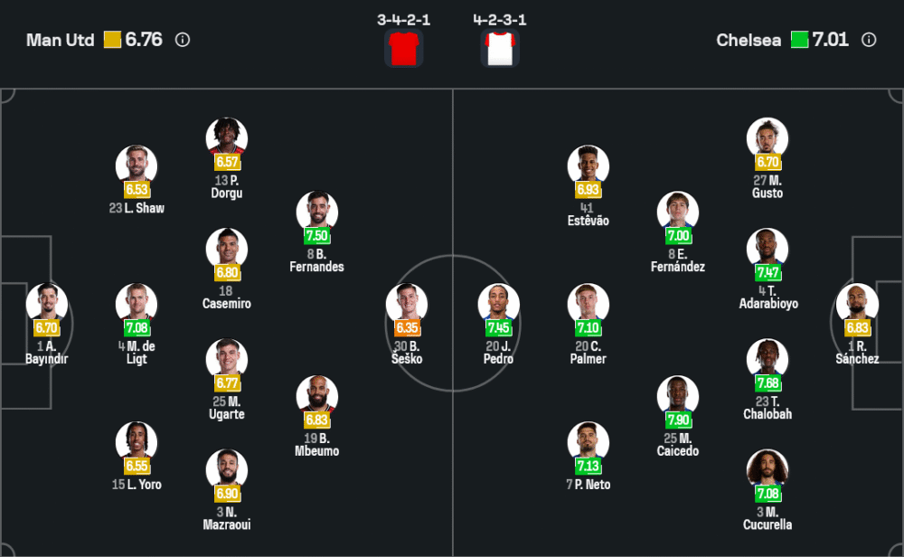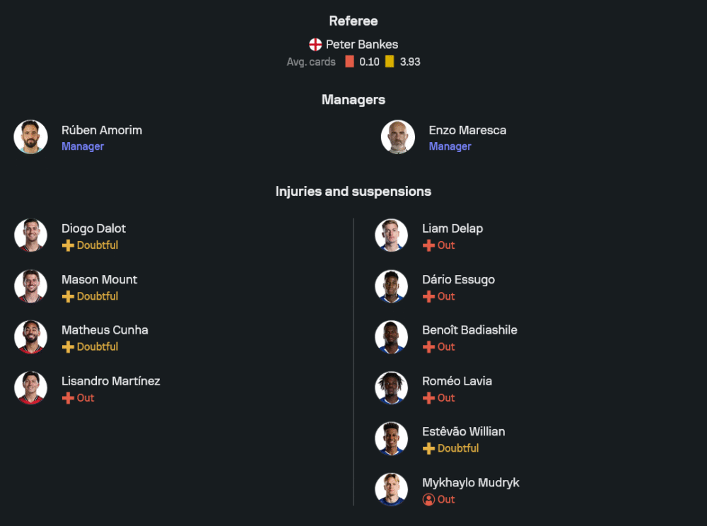 มุมมองเชิง วิเคราะห์บอล เกมนี้จะวัดกันที่แดนกลางล้วน ๆ ยูไนเต็ดต้องกันพื้นที่ไม่ให้ เฟร์นานเดซ–ไคเซโด้ ขึงเกมและปล่อย พัลเมอร์ เลี้ยงตัดเข้าในได้ง่าย เพราะหากโดนไล่บี้แล้วเสียบอลบริเวณครึ่งทางบ่อย ๆ แนวรับเจ้าถิ่นจะงานเข้า โดยเฉพาะจังหวะดวลหนึ่งต่อหนึ่งของฟูลแบ็กกับปีกเชลซี ด้านผีแดงเองมีทีเด็ดสวนกลับผ่านเอ็มโบโม่และการโหม่งของเชสโก้—ถ้าบอลเปิดคุณภาพถึง จุดพลิกเกมก็มาได้เหมือนกัน