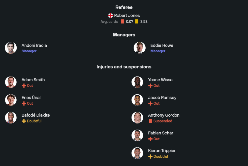 ฝั่งทีมเยือนของ เอ็ดดี้ ฮาว สถานการณ์ไม่สู้ดีนัก เนื่องจากมีผู้เล่นเจ็บหลายราย ทั้ง โยแอน วิสซ่า, จาค็อบ แรมซี่ย์ และฟาเบียน ชาร์ แถมยังมี คีแรน ทริปเปียร์ ที่สภาพร่างกายไม่เต็มร้อย อย่างไรก็ตามพวกเขายังพอฝากความหวังไว้ที่ บรูโน่ กีมาไรส์, ซานโดร โตนาลี่ และโชเอลินตอน ในแดนกลาง ส่วนแนวรุกจะมี ฮาร์วี่ย์ บาร์นส์ และ เจค็อบ เมอร์ฟี่ ร่วมกับหัวหอกใหม่ นิโค วอลท์มาด้า ที่ฟอร์มเริ่มเข้าที่
