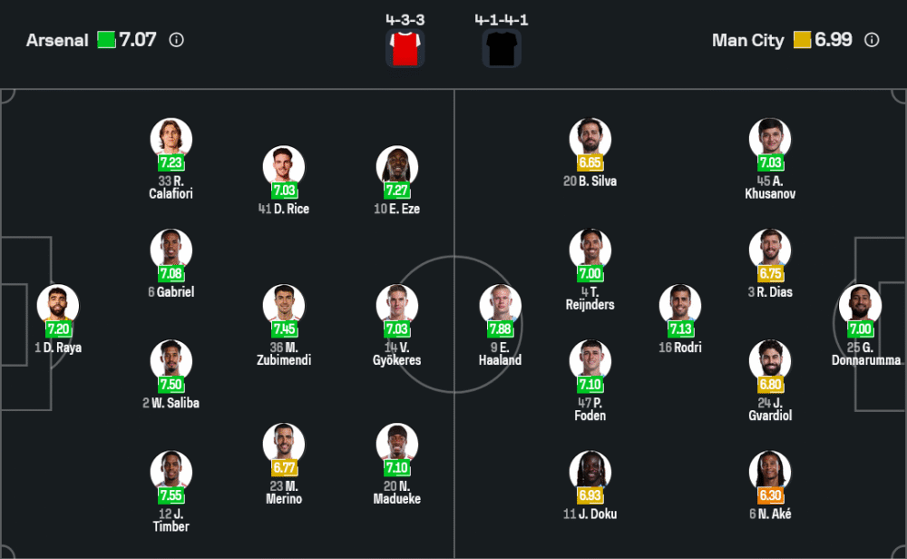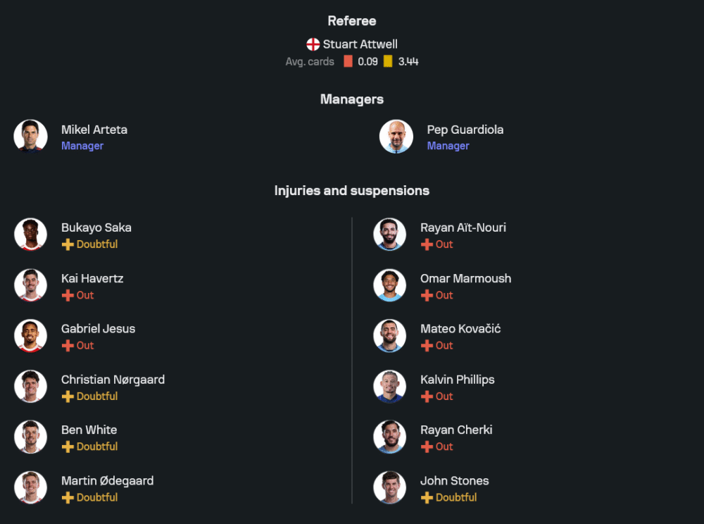 ลูกทีมของ มิเกล อาร์เตต้า กำลังเจอปัญหาหนักในเรื่องตัวผู้เล่น เพราะต้องขาดทั้ง กาเบรียล เฮซุส, ไค ฮาแวร์ตซ์, มาร์ติน โอเดการ์ด และเบน ไวท์ แถมยังมี บูกาโย่ ซาก้า และ คริสเตียน นอร์การ์ด ที่สภาพร่างกายไม่สมบูรณ์ คาดว่าเกมนี้จะจัดระบบ 4-3-3 ใช้ โนนี่ มาดูเอเก้, เลอันโดร ทรอสซาร์ และเอเบเรชี่ เอเซ่ เป็นสามประสานแดนหน้า โดยมี ดีแคลน ไรซ์ คุมแดนกลางร่วมกับ มาร์ติน ซูบิเมนดี้ และ มิเกล เมริโน่ แนวรับนำโดย วิลเลียม ซาลิบา และ กาเบรียล มากัลเญส