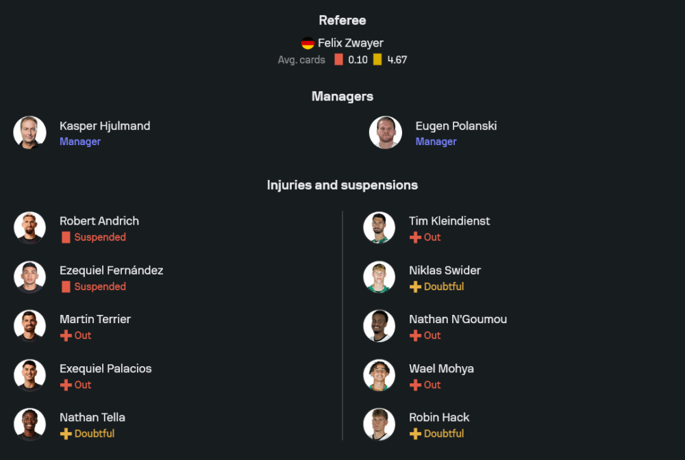 ยูเกิน โปลันสกี้ ยังต้องลุ้นความฟิตของ นิกลาส ชวีเดอร์ และ โรบิน ฮัค (เจ็บเล็กน้อย) ขณะที่ตัวเจ็บยาวยังมี ทิม ไคลน์ดีนสต์, นาธาน เอ็นกูมู และ วาเอล โมห์ย่า สภาพทีมจึงต้องหมุนเฉพาะจุด ระบบ 4-2-3-1 ยังเป็นแกนหลัก แดนกลางใช้คู่คุมจังหวะ ร็อคโก้ ไรทซ์ กับ ฟิลิปป์ ซานเดอร์ สามแนวรุกวาง ฟร้องก์ โอโนราต์ ด้านขวา, จีโอวานนี่ เรย์น่า ยืนเพลย์เมกเกอร์ และหากฮัคผ่านฟิตพร้อมออกสตาร์ททางซ้าย หน้าเป้าเป็น ชูโตะ มาชิโนะ ที่ยังรอประตูแรกในลีก แนวรับใช้ โจ สคัลลี่, นีโก เอลเวดี้, เควิน ดิกส์ และ ลูคัส อูลริช เฝ้าเสา มอริตซ์ นิโกลัส รับหน้าที่ต่อ