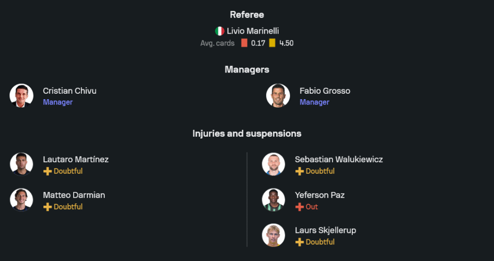ทีมของ ฟาบิโอ กรอสโซ่ เพิ่งปลดล็อก 3 แต้มแรกในลีกด้วยการเชือดลาซิโอ 1-0 เสริมขวัญก่อนยกพลเยือนเมืองมิลาน ขุมกำลังก่อนเกมต้องเช็กฟิต เซบาสเตียน วาลูคีวิซ กับ เลาร์ส สกเยลเลอรุป ขณะที่ เยเฟอร์ซอน ปาซ ยังเดี้ยงอยู่ แต่แนวรุกพร้อมลุยเต็มพิกัดด้วยสามประสานที่คุ้นหูคอบอลกัลโช่—โดเมนิโก้ เบราร์ดี้, อันเดรีย ปินามอนติ และ อาร์ม็อง ลอรีย็องเต กลางสนามฝากความหนักแน่นไว้กับ เนมานย่า มาติช, อัสเตอร์ วรานค์ซ และ อิสมาเอล โกเน่ ส่วนแนวรับมี เจย์ อิดเซส จับคู่ ตาริค มูฮาเรโมวิช ฟูลแบ็กขวา อเมอร์ มูริช ซ้าย จอช ดอยก์ พร้อมรับมือคลื่นบุกเจ้าบ้าน แท็กติกน่าจะมารับแน่นแล้วสวนคม หวังใช้ความคล่องแคล่วของปีกสองฝั่งโจมตีพื้นที่ด้านหลังวิงแบ็กอินเตอร์