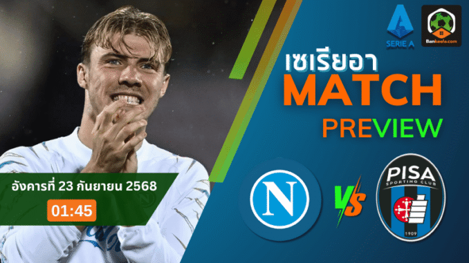 ศึก กัลโช่ เซเรีย อา คืนวันอังคารที่ 23 กันยายน 2568 เวลา 01.45 น. แฟนบอลทั่วโลกต้องจับตา เมื่อ นาโปลี ทีมยักษ์ใหญ่ของลีก เปิดบ้านสนาม สตาดิโอ ดิเอโก้ อาร์มานโด มาราโดน่า ต้อนรับการมาเยือนของ ปิซ่า ทีมน้องใหม่ที่กำลังดิ้นรนเอาตัวรอดในลีกสูงสุดซีซั่นนี้ เกมนี้ไม่ใช่เพียงการวัดศักดิ์ศรี แต่ยังเป็นการวัดความมั่นใจของทั้งสองสโมสร โดยเฉพาะเจ้าบ้านที่มีเป้าหมายชัดเจนในการไล่ล่าแชมป์