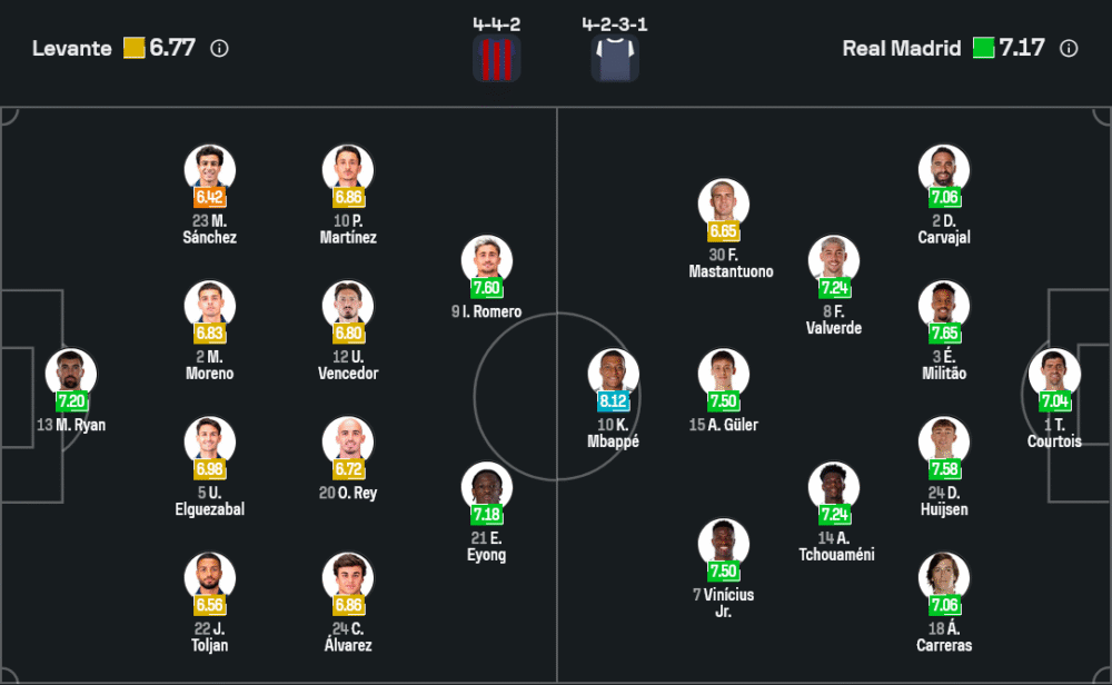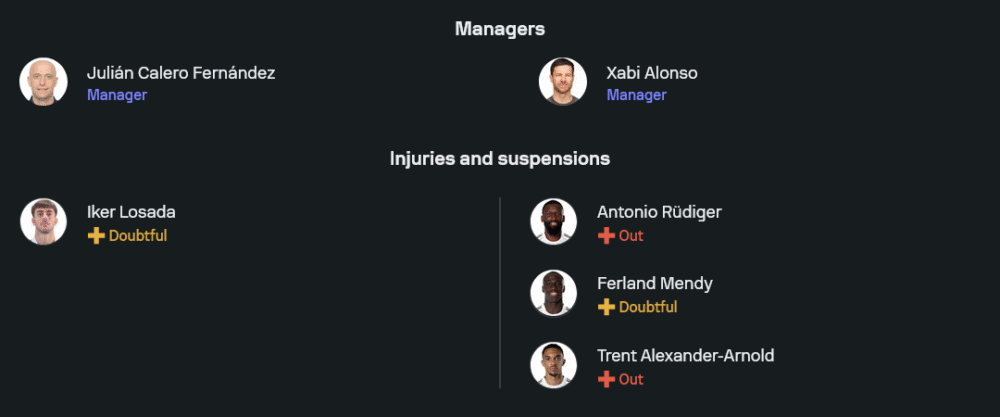 ฝั่งราชันชุดขาวภายใต้การคุมทีมของ ชาบี อลอนโซ่ เจอปัญหาไม่น้อย โดยมีแข้งเดี้ยงสำคัญอย่าง อันโตนิโอ รือดิเกอร์ และ เทรนต์ อเล็กซานเดอร์-อาร์โนลด์ ที่หมดสิทธิ์ลงเล่น รวมถึง แฟร์กล็อง เมนดี้ ที่ยังต้องเช็กสภาพร่างกาย อย่างไรก็ตามแนวรุกยังอันตรายครบเครื่อง ทั้ง คิเลียน เอ็มบัปเป้, วินิซิอุส จูเนียร์ และ อาร์ดา กูเลอร์ พร้อมกดดันแนวรับคู่แข่งเต็มพิกัด
