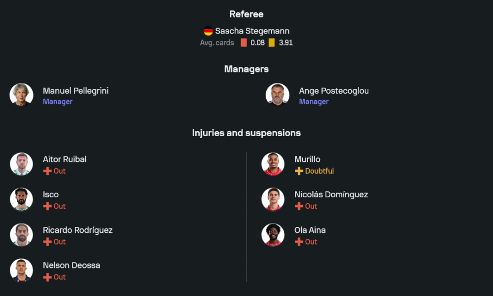 ทีมเยือนของกุนซือ อังเก้ ปอสเตโคกลู สภาพทีมยังไม่นิ่งนัก เมื่อ นิโกลาส โดมิงเกวซ และ โอล่า ไอน่า ต้องพักยาว ขณะที่ มูริลโล่ ยังต้องรอเช็กความฟิต แต่โดยรวมยังพอจัดทัพในระบบ 4-2-3-1 ได้ครบครัน เกมรับใช้ นิโคล่า มิเลนโควิช ยืนคุมแนวหลัง ส่วนแดนกลางฝากความหวังไว้ที่ ดักลาส หลุยซ์ และ เอลเลียต แอนเดอร์สัน เกมรุกจัดชุดใหญ่มี มอร์แกน กิ๊บบ์ส-ไวท์, คัลลั่ม ฮัดสัน-โอดอย และ แดน เอ็นดอย ปั้นเกมสนับสนุนหอกเป้า คริส วู้ด ที่พร้อมทะลวงแนวรับเจ้าถิ่น