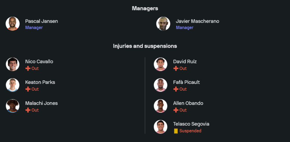 กุนซือ ปาสคาล แยนเซ่น เจอปัญหาผู้เล่นบาดเจ็บหลายราย ไม่ว่าจะเป็น นิโก้ คาวัลโล่, คีตัน พาร์คส์ และ มาลาชี โจนส์ ที่หมดสิทธิ์ลงสนาม อย่างไรก็ตาม ขุมกำลังหลักยังครบครัน โดยมี อัลลอนโซ่ มาร์ติเนซ ที่เพิ่งยิงเบิ้ลจากเกมล่าสุดลงเป็นหน้าเป้า พร้อมด้วยแผงกลางนำโดย มักซี่ โมราเลซ และ ซานติอาโก้ โรดริเกซ สนับสนุนเกมรุก ขณะที่แนวรับฝากความหวังไว้กับ ติอาโก้ มาร์ตินส์ และผู้รักษาประตู แมตต์ ฟรีส