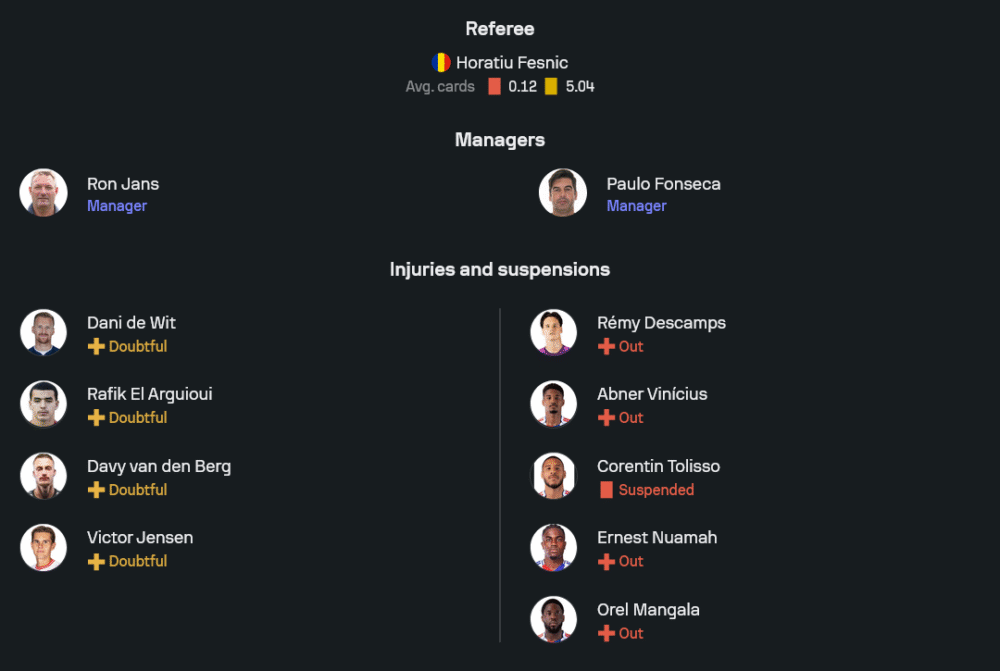 ฝั่งทีมเยือนของ Paulo Fonseca สภาพทีมก็ไม่น้อยหน้า ปัญหาบาดเจ็บและโทษแบนเพียบ ไล่ตั้งแต่ Rémy Descamps, Abner Vinícius, Ernest Nuamah, Orel Mangala ที่เจ็บยาว ส่วน Corentin Tolisso ก็ติดโทษแบน แต่ยังดีที่แกนหลักอย่าง M. Satriano, Malick Fofana, Ainsley Maitland-Niles และ Nicolás Tagliafico พร้อมประจำการ คาดว่าจะมาในระบบ 4-2-3-1 เช่นกัน วาง Satriano ยืนหน้าเป้า มี Fofana และ Karabec คอยเติมเกมรุกริมเส้น