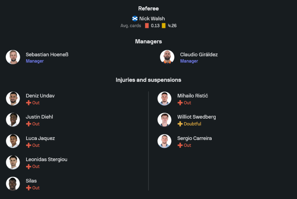เซบาสเตียน ฮูเนส วางหมากถนัดในระบบ 4-2-3-1 เน้นสปีดริมเส้นและการต่อบอลฉับไว แผงรับมี อเล็กซานเดอร์ นูเบล เฝ้าเสา ด้านขวา ลอเรนซ์ อัสซิยง ซ้าย มักซิมิเลี่ยน มิตเติ้ลสตัดท์ คู่เซ็นเตอร์ ฟินน์ เยล์ตช์ จับคู่ เจฟฟ์ ชาบ็อต กลางคู่ใช้ คอนสแตนตินอส อันเดรียส คุมจังหวะร่วม อังเจโล่ สติลเลอร์ โดยมีสามประสานเกมรุก ติอาโก้ โธมัส – บิลาล เอล คาห์นนุส – เจมี่ เลเวลิ่ง ปั้นเกมหลังหอกเดี่ยว เออร์เมดิน เดมิโรวิช ส่วนข่าวร้ายคือแข้งเจ็บยาวชุดใหญ่ ทั้ง เดนิซ อุนดาฟ, ซิลาส, จัสติน ดีห์ล, เลโอนิดาส สเตอร์กิอู และ ลูก้า จ๊ากเวซ ยังชวดทั้งหมด แต่ขุมกำลังที่เหลือกำลังเข้าที่และคึกหลังเพิ่งเก็บคลีนชีตเกมลีก