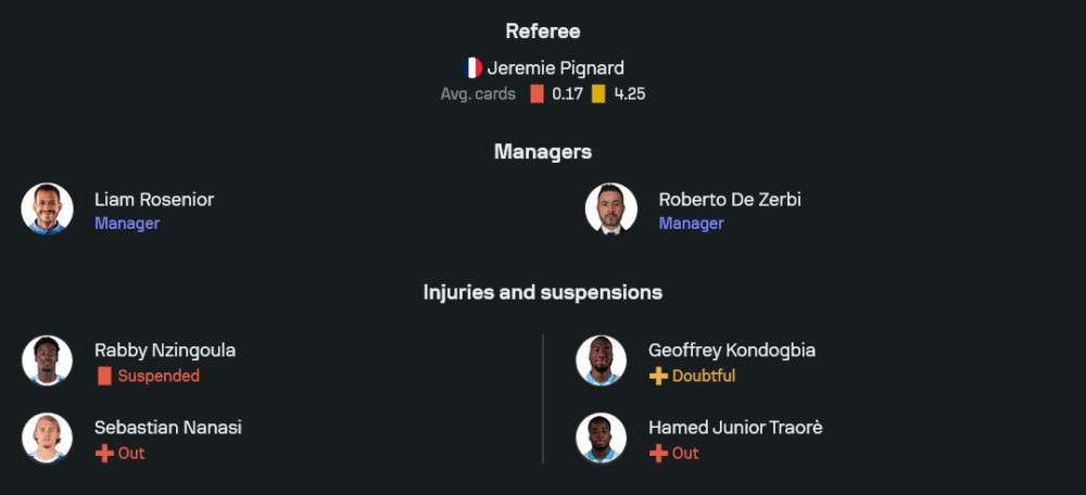 ด้านทีมเยือนของ โรแบร์โต้ เด แซร์บี ได้ใจกับชัยชนะนัดใหญ่เหนือเปแอสเช แต่ต้องรีบปรับโหมดเกมเยือนให้เนียนกริบ สถานะผู้เล่นมีข่าวดีร้ายคละกัน เจฟฟรีย์ กงด็อกเบีย มีอาการกล้ามเนื้อตึงต้องลุ้นเช็คฟิต ขณะที่ ฮาเหม็ด จูเนียร์ ตราโอเร่ ยังเจ็บต่อเนื่อง แกนหลักที่พร้อมบู๊วางระบบ 4-2-3-1 ผู้รักษาประตู เฆโรนิโม รุลลี่ ยืนตัวจริง กำแพงหลังมี เบนฌาแม็ง ปาวาร์, เลโอนาร์โด้ บาเล르ดี้, ฟาคุนโด เมดินา และ เอเมอร์สัน กลางรับคู่ ปิแอร์-เอมิล ฮอยเบียร์ก ผนึกกำลัง (หากฟิต) กับ กงด็อกเบีย หรือปรับใช้ดาวรุ่งแทน สามตัวรุกจัด เมสัน กรีนวูด ทางขวา, ทิโมธี เวอาห์ ทางซ้าย, แม็ตต์ โอ’ไรลีย์ คุมจังหวะกลางรุก และหน้าเป้าเป็นจอมเก๋า ปิแอร์-เอเมริค โอบาเมยอง ที่ฟอร์มสม่ำเสมอ