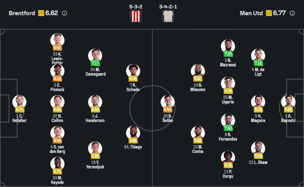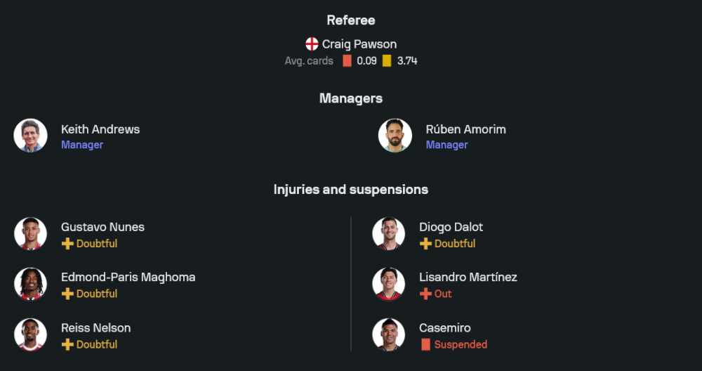 รูเบน อาโมริม กุนซือใหม่ที่กำลังเนื้อหอม จัดระบบ 3-4-2-1 วาง เบนจามิน เซสโก้ เป็นหัวหอกหน้าเป้า โดยมี บรีย็อง เอ็มโบโม่ และ มาเธอุส คุนญ่า เป็นสองแนวรุกช่วยปั้นเกม บรูโน่ แฟร์นานเดส พร้อมยืนคุมแดนกลาง ขาดเพียง คาเซมิโร่ ที่ติดโทษแบน และ ลิซานโดร มาร์ติเนซ กับ ดิโอโก้ ดาโลต์ ที่ยังบาดเจ็บ