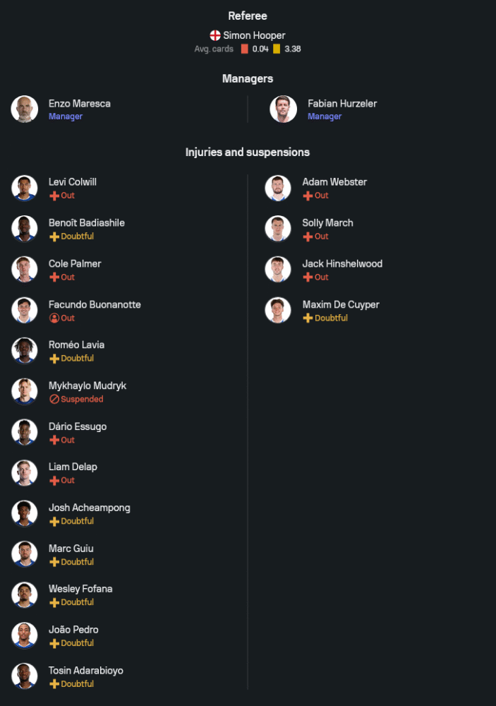 เอนโซ่ มาเรสก้า นายใหญ่ของเชลซี เตรียมจัดทัพเต็มสูบในระบบ 4-2-3-1 โดยมี เชา เปโดร ยืนหน้าเป้าล่าตาข่าย ขนาบข้างด้วย เปโดร เนโต้ และ เอสเตเวา ขณะที่จอมทัพอย่าง เอ็นโซ่ เฟร์นานเดซ จะทำหน้าที่สร้างสรรค์เกมรุก ส่วนแดนกลางมี มอยเซส ไซเซโด้ จับคู่กับ อันเดรย์ ซานโต๊ส คุมจังหวะ เกมรับใช้ รีซ เจมส์ และ มาร์ก กูกูเรญ่า ขนาบข้างสองขาใหญ่ ชาโลบาห์ และ โฟฟาน่า เฝ้าเสาโดย โรเบิร์ต ซานเชซ ที่พ้นโทษแบนกลับมาประจำการอีกครั้ง