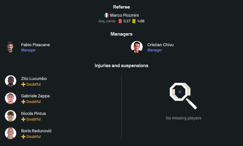 ฟาบิโอ ปิซาคาเน่พาทีมกำลังติดลมบน ชนะมา 3 จาก 4 นัดหลังรวมบอลถ้วย ขุมกำลังตัวจริงยึดโครง 3-5-2 ตามภาพรวมล่าสุดจากไลน์อัพ นัดนี้ผู้รักษาประตูยังเป็น เอเลีย คาปริเล่ โดยมีสามเซ็นเตอร์ เยร์รี่ มินา, เซบาสเตียโน ลูแปร์โต้ และดาวรุ่ง มาร์โก ปาเลสตรา คอยยืนแน่นหน้ากรอบ วิงแบ็กซ้ายใช้ อดัม โอแบร์ต ทางขวาน่าจะสลับเป็น มาโนลิส ซาเลียกัส แดนกลางจัด ไมเคิล โฟโลรุนโช่, มัตเตโอ ปราตี และ มิเชล อาโดโป คุมจังหวะ เกมรุกฝากความหวังไว้ที่ อันเดรีย เบล็อตติ หัวหอกประสบการณ์สูงจับคู่กับ เซบาสเตียโน เอสโปซิโต้ ที่กำลังมั่นใจ สภาพทีมยังต้องลุ้นความฟิตของ ซีโต้ ลูวุมโบ กับ กาบริเอเล่ ซัปป้า ส่วน บอริส ราดูโนวิช ยังไม่พร้อม
