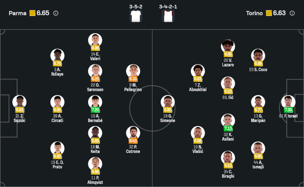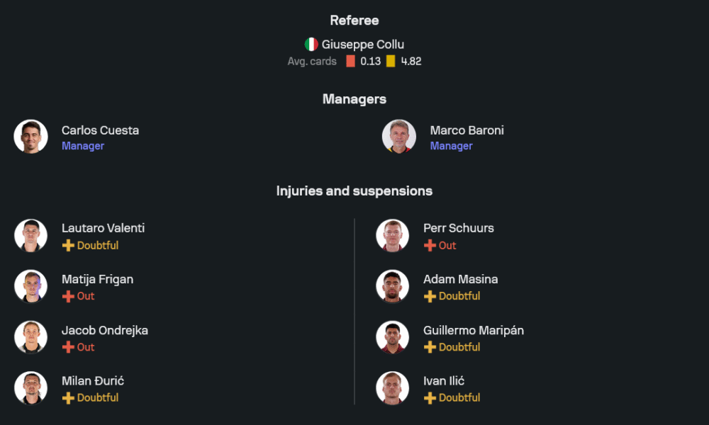คาร์ลอส คูเอสต้า เตรียมทีมมาในระบบ 3-5-2 โดยมี ไซออน ซูซูกิ เฝ้าเสา แนวรับวาง เอ็นริโก้ เดล ปราโต้, อเลสซานโดร ชีร์กาติ, อับดูลาย เอ็นเดียเย่ เป็นแผงหลัง ขยับขึ้นมากลางสนามใช้ อาเดรียน เบร์นาเบ คุมเกมร่วมกับ มันเดลา เกอิต้า และ โอลิเวอร์ โซเรนเซ่น ขนาบข้างด้วย เอ็มมานูเอเล วาเลรี และ มาติอัส โลวิค ส่วนแดนหน้าเป็นหน้าที่ของ แพทริค คูโตรเน่ และ มาเตโอ เปลเลกริโน่ สภาพทีมยังมีปัญหาผู้เล่นเจ็บอย่าง ยาค็อบ ออนเดรยก้า และ มาติย่า ฟริกัน ที่ไม่พร้อมลงสนาม