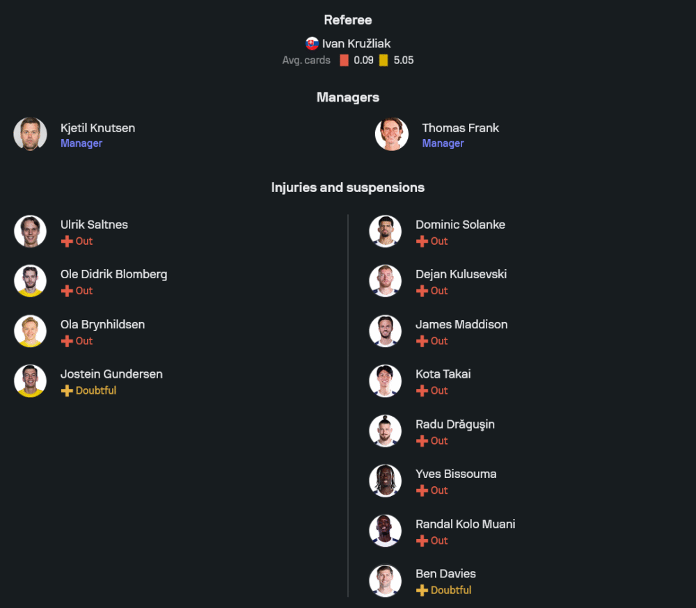 โธมัส แฟรงค์ เจอปัญหาตัวรุกเจ็บยาวหลายราย ทั้ง โดมินิค โซลันกี้, เดยัน คูลูเซฟสกี้, เจมส์ แมดดิสัน, ราดู ดรากูชิน, โคตะ ทาคาอิ และ อีฟส์ บิสซูม่า ขณะที่ แรนดัล โคโล มูอานี ยังไม่เต็มร้อย ส่วน เบน เดวีส์ ต้องรอเทสต์ความฟิต โครงสร้างทีมจึงน่าจะยึด 4-3-3 นายทวารเป็น กูเยลโม่ วิคาริโอ แนวรับวาง เปโดร ปอร์โร่ กับ เช็ด สเปนซ์ ยืนฟูลแบ็ก คู่เซ็นเตอร์มี คริสเตียน โรเมโร กับ มิกกี้ ฟาน เดอ เวน กลางสามหมุนด้วย พาเป้ ซาร์ จับคู่ ปาลินญ่า และ ลูคัส เบิร์กวาลล์ เพื่อเน้นหนักเกมเพรสซิ่ง ส่วนแนวรุกฝากความหวังไว้กับ เบรนแนน จอห์นสัน และ วิลสัน โอโดแบร์ ป้อนกระสุนให้ ริชาร์ลิซอน เป็นหน้าเป้าค้ำหอก