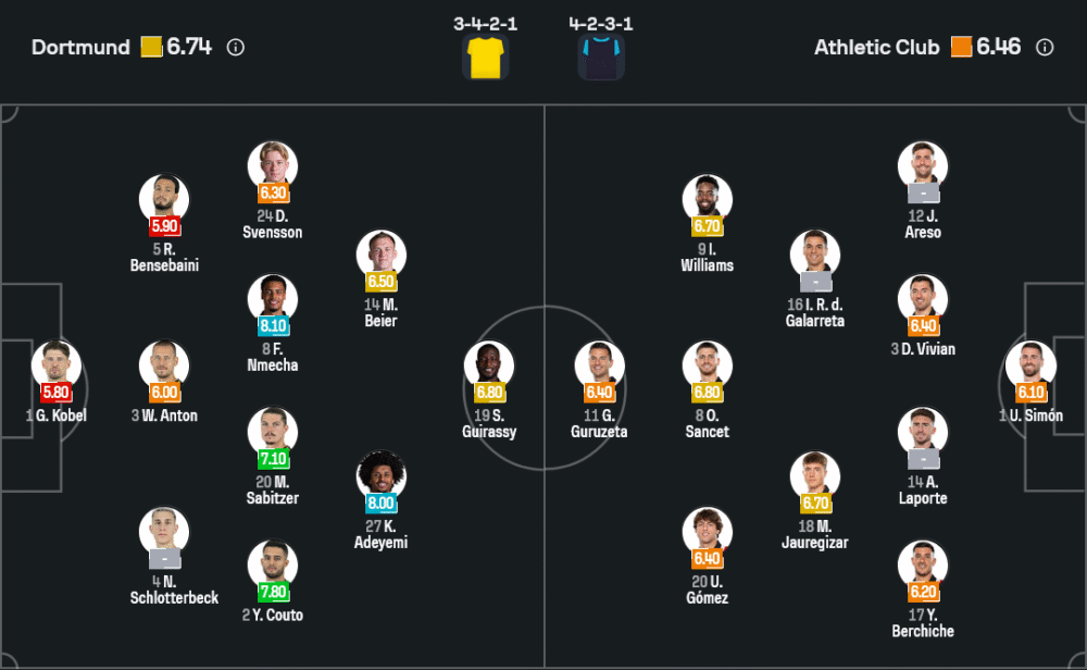 ดอร์ทมุนด์ (3-4-2-1): เกรกอร์ โคเบล; วัลเดมาร์ อันตอน, นิโก้ ชล็อตเตอร์เบ็ค, รามี่ เบนเซไบนี่; ยาน คูโต้, มาร์เซล ซาบิตเซอร์, เฟลิกซ์ เอ็นเมช่า, ดาเนี่ยล สเวนส์สัน; มักซิมิเลียน ไบเออร์, คาริม อเดเยมี่; เชห์รู กีราสซี่