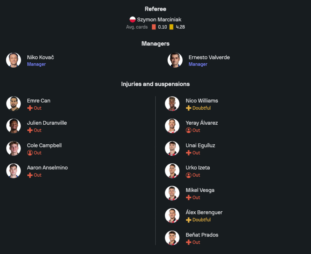 นิโก้ โควัช ต้องขาดแกนหลักบางราย ทั้ง เอ็มเร่ ชาน, จูเลียง ดูรานวิลล์, โคล แคมป์เบลล์ และ อารอน อันเซลมิโน่ ที่ยังเดี้ยง แต่ข่าวดีคือหัวหอกตัวอันตรายอย่าง เชห์รู กีราสซี่ พร้อมคืนสนาม หลังพลาดเกมลีกนัดก่อน ระบบที่คาดคือ 3-4-2-1 ให้ เกรกอร์ โคเบล เฝ้าเสา แนวรับเรียงสามเป็น วัลเดมาร์ อันตอน, นิโก้ ชล็อตเตอร์เบ็ค และ รามี่ เบนเซไบนี่ วิงแบ็กขวา ยาน คูโต้ ซ้ายใช้ ดาเนี่ยล สเวนส์สัน คู่กลาง มาร์เซล ซาบิตเซอร์ ประคองจังหวะร่วมกับ เฟลิกซ์ เอ็นเมช่า ส่วนสองจอมสร้างสรรค์ด้านหลังหน้าเป้าเป็น คาริม อเดเยมี่ กับ มักซิมิเลียน ไบเออร์ ปั้นเกมให้ กีราสซี่ ปิดบัญชี