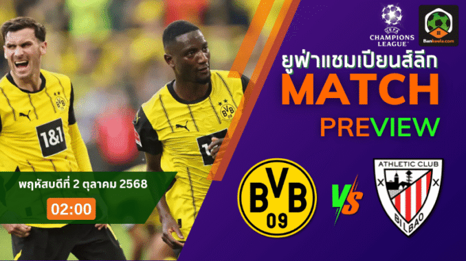 ศึก ยูฟ่า แชมเปียนส์ลีก คืนวันพฤหัสบดีที่ 2 ตุลาคม 2568 เวลา 02:00 น. แฟนบอลเตรียมรับความมันส์เต็มอัตราเมื่อ โบรุสเซีย ดอร์ทมุนด์ เปิดรังซิกนัล อิดูน่า พาร์ค รับการมาเยือนของ แอธเลติก บิลเบา ทีมเลือดบาสก์จากสเปน เรตเปิดให้เจ้าถิ่นต่อ 0.5 ด้วยดีกรีความจัดจ้านในบ้านและแรงกดดันจากสังเวียนสีเหลืองอันลือลั่น เกมนี้มีทุกอย่างให้ลุ้นตั้งแต่จังหวะเพรสซิ่งดุดันไปจนถึงความคมของแนวรุกทั้งสองฝั่ง ใครเช็ก ตารางบอลวันนี้ อยู่ บอกเลยว่าคู่นี้คือตัวท็อปของค่ำคืน