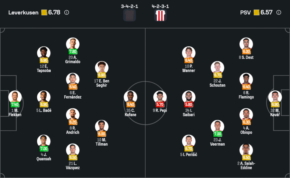 เลเวอร์คูเซ่น (3-4-2-1) : มาร์ค เฟล็คเค่น; จาเรลล์ ควอนซ่าห์, โลอิค บาเด้, ลูคัส บาสเกซ; อักเซล เทป โคบริสซา, อเล็กซ์ การ์เซีย, เอเซเกียล เฟร์นันเดซ, อเล็กซ์ กริมัลโด้; มาลิก ทิลล์มันน์, เอลีสเซ่ เบน เซกีร์; คริสเตียน โคฟาเน่