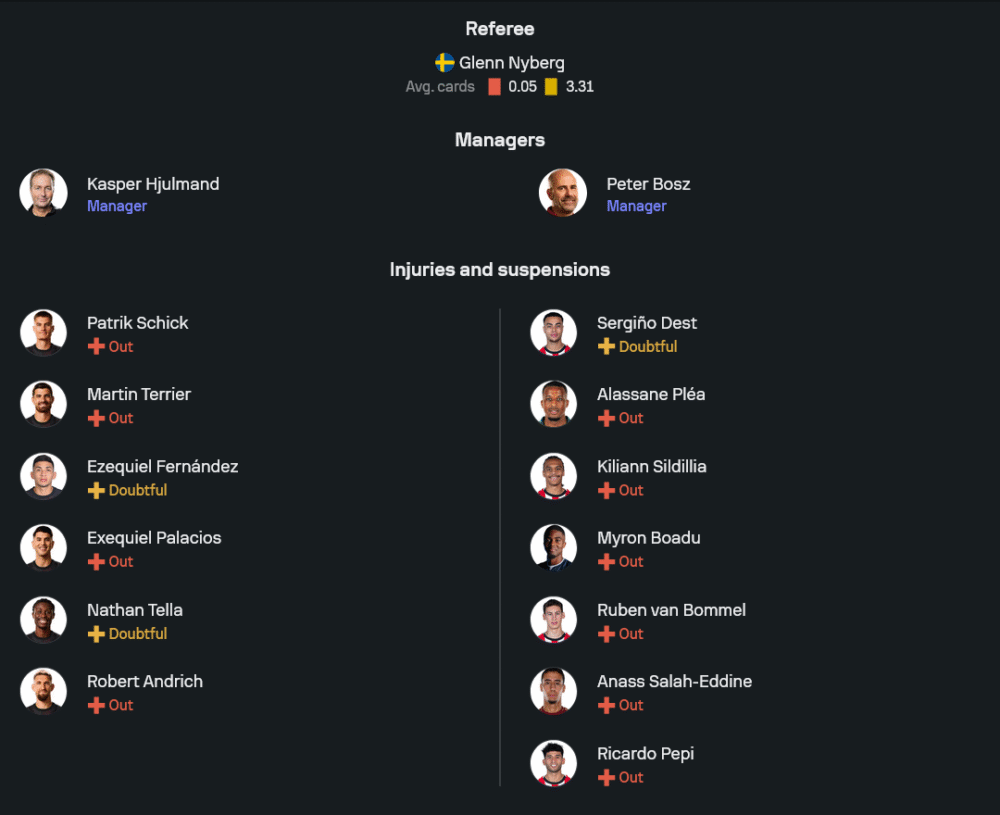 แคสเปอร์ ฮยุลมันด์ รับมือปัญหาตัวเจ็บหลายราย รายชื่อล่าสุดมี โรเบิร์ต อันดริช ห้องเครื่องกัปตันทีมที่เจ็บขาหนีบ, ปาทริค ชิค ที่เจ็บแฮมสตริง เสริมด้วย เอเซเกียล ปาลาซิออส และ มาร์กแต็ง เตริเย่ร์ ที่ยังเดี้ยง ส่วน นาธาน เทลลา อยู่ในกลุ่มเช็กฟิต โชคดีที่แนวรุกสำคัญยังพร้อมทั้ง เอลีสเซ่ เบน เซกีร์ และ มาลิก ทิลล์มันน์ ที่กำลังมั่นใจ คาดใช้แผน 3-4-2-1 วิงแบ็กขับเคลื่อนด้วย อเล็กซ์ กริมัลโด้ ฝั่งซ้าย จับคู่พลังพุ่งกับ อักเซล เทป โคบริสซา ทางขวา สองกลางยืนคุมพื้นที่เป็น อเล็กซ์ การ์เซีย กับ เอเซเกียล เฟร์นันเดซ ตัวรุกหลังหน้าเป้าเป็น ทิลล์มันน์ กับ เบน เซกีร์ คอยป้อนบอลให้ คริสเตียน โคฟาเน่ หัวหอกตัวค้ำยิงปิดงาน ส่วนด่านสุดท้ายฝากมือ มาร์ค เฟล็คเค่น เฝ้าเสา ขณะที่แนวรับสามคนคาดว่าเป็น จาเรลล์ ควอนซ่าห์, โลอิค บาเด้ และ ลูคัส บาสเกซ บล็อกเกมรุกทีมเยือน