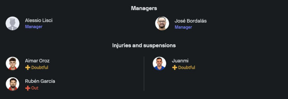 ลูกทีมของกุนซือ อเลสซิโอ้ ลิสซี่ ยังคงเน้นระบบ 3-5-2 ที่เน้นความแน่นอนในแดนกลางและการสวนกลับ โดยคู่หัวหอกอย่าง อันเต้ บูดิเมียร์ จับคู่กับ ราอูล การ์เซีย พร้อมได้รับการสนับสนุนจากมิดฟิลด์ตัวรุกอย่าง มอย โกเมซ ที่ทำเกมได้อย่างเฉียบขาด แดนกลางยังมี ลูกัส ตอร์โร่ และ ฆอน มอนกาโยล่า คอยคุมจังหวะ ส่วนแนวรับฝากความหวังไว้กับ อเลฆานโดร กาเตน่า, วาล็องแต็ง โรซิเย่ร์ และ เอ็นโซ่ โบโยโม่ ขณะที่ผู้รักษาประตูใช้ เซร์กิโอ้ เอร์เรร่า ลงเฝ้าเสา เกมนี้ขาดเพียง รูเบน การ์เซีย ที่ยังเจ็บยาว และ ไอมาร์ โอรอซ ที่ต้องเช็กฟิตก่อนเกม
