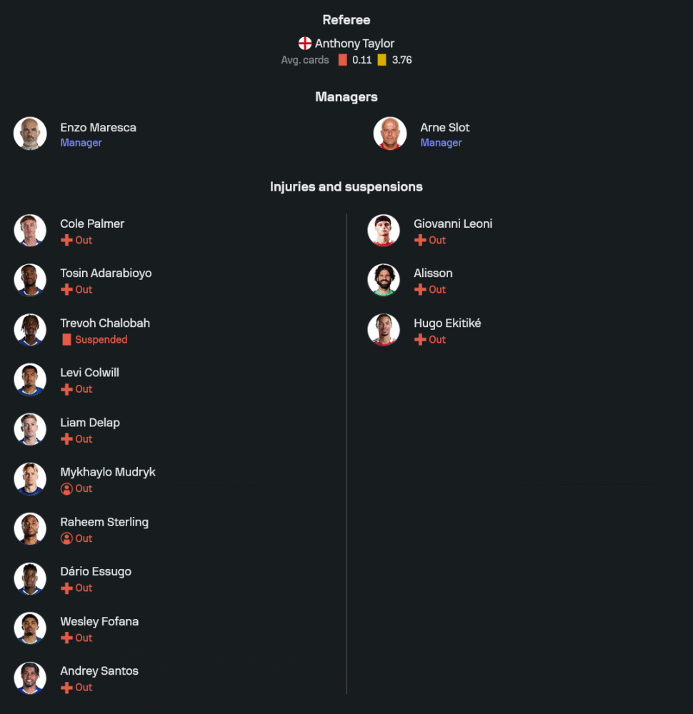 ปัญหาหลักของ เชลซี ตอนนี้คืออาการบาดเจ็บที่รุมเร้าแทบทุกตำแหน่ง ตัวหลักหลายรายทั้ง โคล พัลเมอร์, เลวี่ โคลวิลล์, เวสลีย์ โฟฟาน่า, มายคายโล มัดดริก, ราอีม สเตอร์ลิ่ง และ เลียม ดีแล็ป พากันเดี้ยงไม่พร้อมลงสนาม แถมยังขาด เทรโวห์ ชาโลบาห์ ที่ติดโทษแบน ทำให้ “มาเรสก้า” ต้องปรับใช้เด็กดาวรุ่งและแข้งสำรองลงแทน คาดว่าจะยืนระบบ 4-3-3 โดยมี โรเบิร์ต ซานเชซ เฝ้าเสา แนวรับนำโดย มาร์ค กูกูเรญ่า และ รีซ เจมส์ ขณะที่แดนกลางใช้ มอยเซส ไคเซโด้ คุมเกมร่วมกับ เอ็นโซ่ เฟร์นานเดซ ส่วนแนวรุกฝากความหวังไว้ที่ เปโดร เนโต้ และ เชา เปโดร ที่เพิ่งเรียกฟอร์มเก่งกลับมา