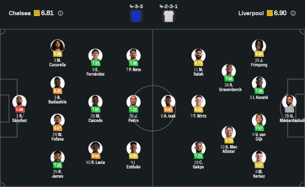 “เอนโซ่ มาเรสก้า” นายใหญ่เชลซีจัดทัพในระบบ 4-3-3 นำโดย เอ็นโซ่ เฟร์นานเดซ, เปโดร เนโต้ และ เชา เปโดร เป็นสามแนวรุก ขณะที่ “อาร์เน่ สลอต” ของลิเวอร์พูลวางหมาก 4-2-3-1 ส่ง อเล็กซานเดอร์ อิซัค ยืนค้ำหน้า พร้อมตัวสนับสนุนสุดโหดอย่าง โมฮาเหม็ด ซาล่าห์, โคดี้ กั๊กโป และ ฟลอเรียน เวิร์ตซ์ พร้อมลงล่าสกอร์ที่สแตมฟอร์ด บริดจ์
