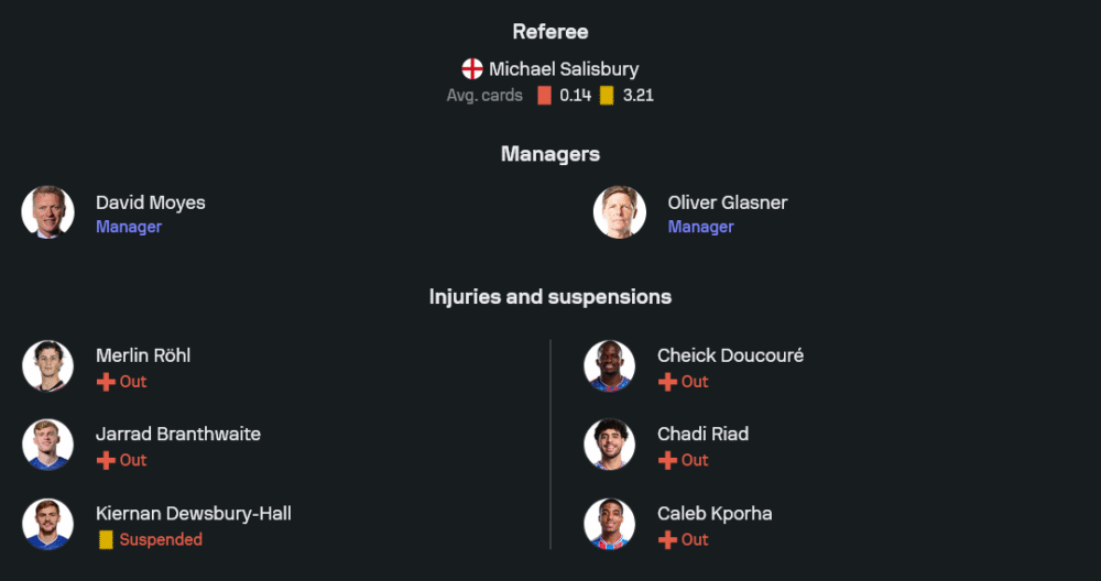 ลูกทีมของ เดวิด มอยส์ กำลังเจอปัญหาเรื่องผู้เล่นบาดเจ็บและติดโทษแบน โดย เคียร์แนน ดิวส์บิวรี่-ฮอลล์ หมดสิทธิ์ลงสนามจากการสะสมใบเหลืองครบโควต้า ขณะที่ เมอร์ลิน โรห์ล และ จาร์แรด แบรนธ์เวต ยังอยู่ในช่วงพักฟื้น ส่งผลให้แผนการเล่นแบบ 4-2-3-1 ต้องพึ่งพา เบโต้ ในการล่าตาข่ายหน้าเป้า มี อิลิมาน เอ็นดิอาย, การ์ลอส อัลการาซ และ แจ็ค กรีลิช คอยสร้างสรรค์เกมรุกอยู่ด้านหลัง ส่วนแดนกลางมี เจมส์ การ์เนอร์ และ อิดริสซ่า กูเอเย่ เป็นแกนหลักคุมจังหวะ