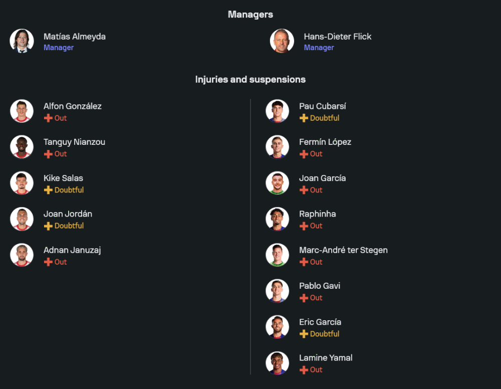 มาติอัส อัลเมย์ด้าได้ข่าวดีบ้างเล็กน้อยเมื่อโครงกระดูกหลักยังอยู่กันครบ แม้ยังไร้นักเตะเดี้ยงอย่าง อัลฟอน กอนซาเลซ และ ต็องกี นีอ็องซู รวมถึงแข้งเช็กฟิตอย่าง กีเก้ ซาลาส และ โฆอัน จอร์ดาน ขุมกำลังจากไลน์อัพล่าสุดจัดหลัง 5 ตัวแน่นหนา ใช้ โอดิสเซอัส วลาโชดิมอส เฝ้าเสา แผงแบ็กมี โฆเซ่ อังเคล การ์โมน่า กับ กาเบรียล ซัวโซ่ ยืนกว้าง สามเซ็นเตอร์คือ เซซ่าร์ อัซปิลิกวยต้า, ฟาบิโอ การ์โดโซ่, และ มาร์เกา กลางสี่คนวาง ลูเซียง อากูเม่ จับคู่ บาติสต้า เมนดี้ คุมจังหวะ ขนาบด้วย รูเบน วาร์กัส และ อเล็กซิส ซานเชซ ทางริมเส้น โดยมี อิสซัก โรเมโร่ เป็นหอกเดี่ยวค้ำแนวรับต่างดาว