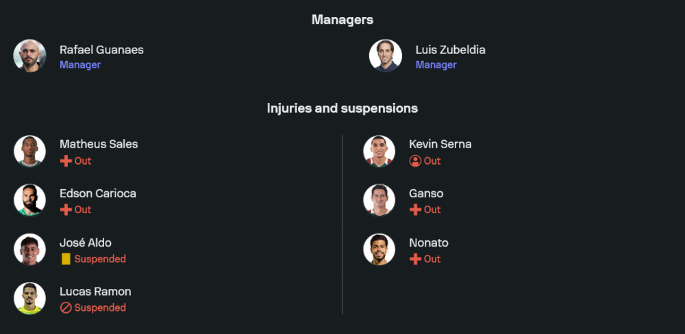 ราฟาเอล กัวนาเอส ต้องเจอปัญหาผู้เล่นตัวหลักหายไปหลายราย ทั้ง ลูคัส รามอน และ โฮเซ่ อัลโด้ ที่ติดโทษแบน รวมถึง เอดสัน คาริโอก้า และ มาเธอุส ซาเลส ที่เจ็บไม่พร้อมลงสนาม อย่างไรก็ตามขุมกำลังหลักยังพร้อมลุย นำโดย ชีโก ดา คอสต้า ยืนหน้าเป้า มี ดาเนียลซินโญ่ กับ เนกูเอบา ปั้นเกมจากด้านหลัง ส่วนแผงหลังยังไว้ใจ เจมเมส, เจ. วิคเตอร์ และ เรนัลโด้ ที่เล่นได้อย่างแข็งแกร่งตลอดซีซั่น