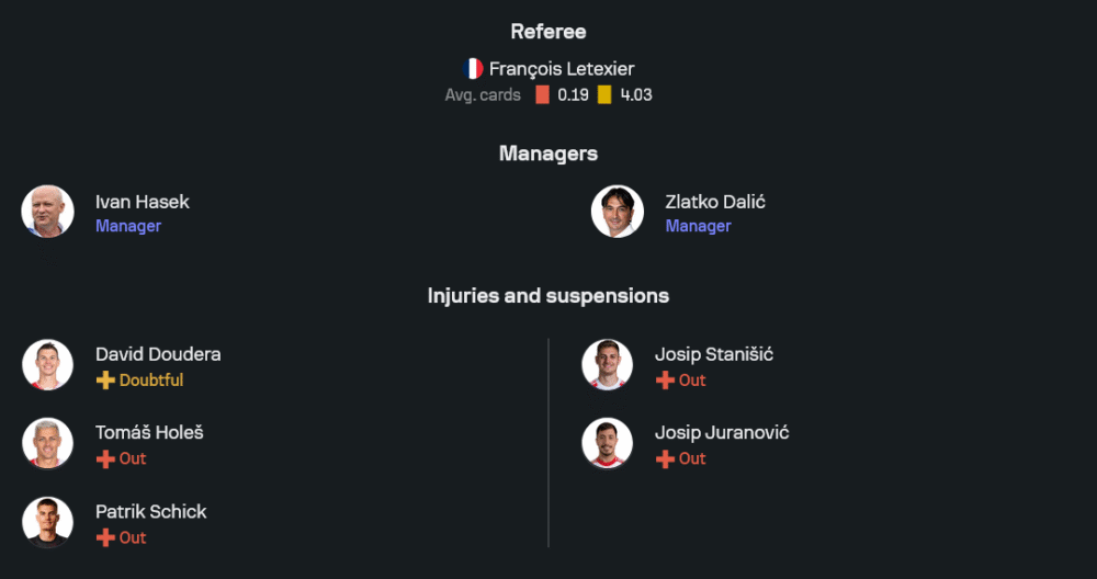 อิวาน ฮาเซ็ค รู้ดีว่าต้องยกระดับความแน่นอนในแดนหลังและความคมแดนหน้า ภาพจากไลน์อัพล่าสุดบอกชัดว่าจะจัดชุดที่แกร่งสุดเท่าที่มี ผู้รักษาประตูเป็น ยินดริช สแตนเน็ค แผงหลังขวาใช้ เดวิด ดูเดอร่า ถ้าผ่านทดสอบความฟิต โดยมีคู่เซ็นเตอร์อย่าง วาคลาฟ เยเมลก้า จับคู่ ลาโดสลาฟ เครจ์ชี ซ้ายเป็น ยาโรสลาฟ เซเลนี คู่มิดฟิลด์ตัวคุมจังหวะให้ โทมัส โซเช็ค ลากเครื่องร่วมกับ ลูคาช เซิร์ฟ สามตัวรุกใช้ ลูคาช โปรว็อด ทางซ้าย ตรงกลางเป็น พาเวล ชูลช์ ขวาให้ วาซิล คูเชย์ คอยสร้างสรรค์และวิ่งกดดันไลน์รับ ส่วนหน้าเป้าเป็น ยาน คุชต้า ที่ถนัดทะลุช่องและชนกับกองหลังตัวใหญ่ การเข้าปะทะลูกกลางอากาศและลูกเซตพีซจะเป็นอาวุธสำคัญของเจ้าถิ่น เกมนี้ยังไร้ชื่อ ปาทริค ชิค และ โทมัส โฮเลส ที่เจ็บยาว ทำให้ภาระจบสกอร์ตกอยู่ที่คุชต้าแบบเต็มตัว