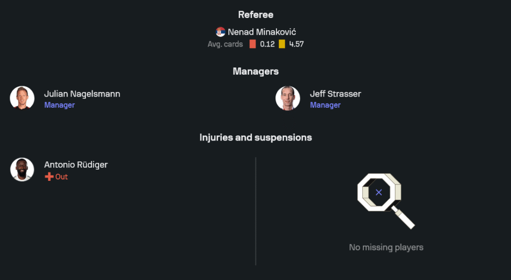เจ้าถิ่นภายใต้การนำของ ยูเลียน นาเกลส์มันน์ ยังอยู่ในช่วงของการปรับจูนทีม หลังจากเสียทั้ง มานูเอล นอยเออร์ ที่ประกาศอำลาทีมชาติ และ มาร์ก-อันเดร แทร์ สเตเกน ที่ยังไม่หายเจ็บ ทำให้ โอลิเวอร์ เบามันน์ ต้องรับบทนายด่านตัวจริงในเกมนี้ แนวรับนำโดย โจนาธาน ทาห์ และ โรบิน ค็อค ส่วนกลางสนามใช้พลังขับเคลื่อนจาก โยชัว คิมมิช และ เลออน โกเร็ตซ์ก้า แนวรุกฝากความหวังไว้ที่ ฟลอเรียน เวิร์ตซ์ และ เซิร์จ นาบรี้ โดยมี นิก วอลเทอมาด ยืนหน้าเป้าในระบบ 4-2-3-1 ซึ่งเป็นแผนถนัดของนาเกลส์มันน์ ที่เน้นความยืดหยุ่นและเกมรุกที่ไหลลื่นตลอด 90 นาที