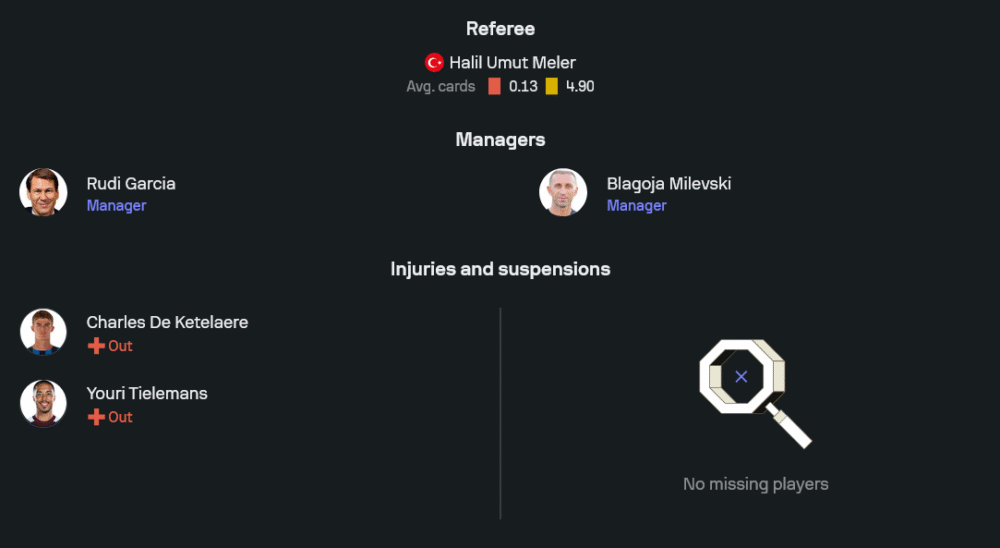 รูปทีมชัดเจนและลงตัวภายใต้การคุมทีมของ รูดี้ การ์เซีย แม้มีข่าวร้ายเรื่องอาการเจ็บของ ชาร์ลส์ เดอ เคเตลาเร และ ยูรี ตีเลมันส์ ที่ต้องถอนตัว แต่โครงหลักยังแน่นปึ้ก เริ่มจากผู้รักษาประตู ติโบต์ กูร์กตัวส์ ที่ฟอร์มคัมแบ็กกำลังนิ่ง แผงหลังยืนด้วย ติโมธี กาสตาญ, เซโน เดบาสต์, อาร์ตูร์ เตอาเต้ และ มักซิม เดอ กุยแปร์ คู่กลางให้ ฮานส์ ฟานาเกน ผสานงานกับ นิโกลาส ราสกิน เปิดทางสามตัวรุกขั้นเทพ เฌเรมี โดกู ทางขวา เควิน เดอ บรอยน์ ยืนจอมทัพ และ เลอันโดร ทรอสซาร์ ทางซ้าย หน้าเป้าไฟแรงคือ โลอิส โอเปนดา ที่พร้อมใส่เกียร์ห้าไล่ล่าตาข่ายตลอด 90 นาที