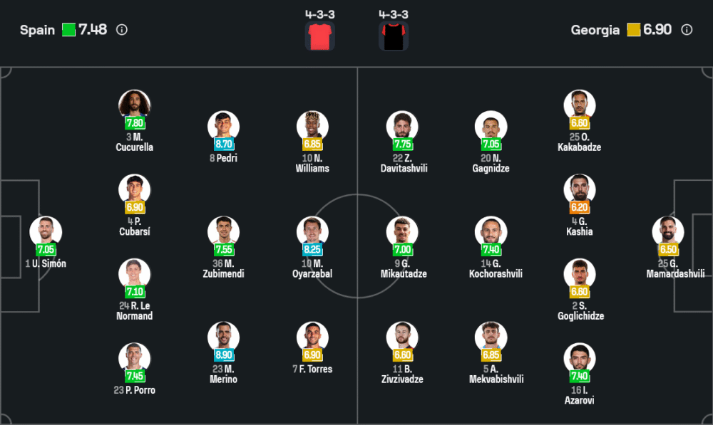 มองรูปเกมโดยรวม สเปนจะครองบอลมากกว่าสูง ใช้การเพรสซิ่งตั้งแต่ฝั่งคู่แข่งบีบให้จอร์เจียจ่ายผิดพลาดแล้วสวนกลับกลับไปในทันที ไลน์รับของทีมเยือนต้องรับมือการเคลื่อนที่ซ้อนตำแหน่งของสามแนวรุกที่สลับพื้นที่กันตลอด ยิ่งถ้ากระทิงดุได้ประตูนำเร็ว เกมจะไหลตามบทเจ้าบ้านอย่างสิ้นเชิง ในทางกลับกัน โอกาสของจอร์เจียอยู่ที่การตัดบอลแรกได้แล้วเปลี่ยนสปีดทันทีสู่พื้นที่ด้านหลังฟูลแบ็ก ทั้งนี้ต้องอาศัยความเฉียบคมระดับสูงและความผิดพลาดของสเปนประกอบกัน