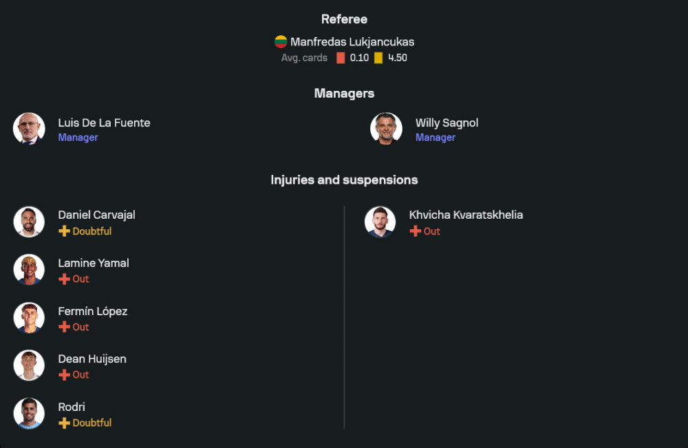 ขุมกำลังของ หลุยส์ เด ลา ฟูเอนเต้ ยังดูแน่นถึงแม้มีรายชื่อเจ็บและเช็กฟิตอยู่บ้าง โครงสร้างเกมรับพึ่งพาแบ็กซ้ายจอมบุกอย่างมาร์ก คูคูเรญ่า ผสานสองเซ็นเตอร์สปีดดีคุมพื้นที่หน้าปากประตู ผู้รักษาประตูไว้ใจอูไน ซิม่อน ด้านกลางสนามคือหัวใจของกระทิงดุ นำโดยเปดรี้ที่อ่านเกมและหมุนบอลได้เร็ว ร่วมกับมาร์ติน ซูบิเมนดี้คอยซ้อนและตัดเกม ส่วนมิเกล เมริโน่เพิ่มลูกหนักและการวิ่งสอดเข้าพื้นที่สุดท้าย สามประสานแดนหน้าติดไฟทุกด้าน นิโก้ วิลเลียมส์มีสปีดเปลี่ยนเกม ทางขวาฝากความไว้ใจให้แบร์นาร์โด้…เดี๋ยว สิ เกมนี้คือสีเสื้อกระทิงดุจึงน่าจะใช้เฟร์ราน ตอร์เรสหรือมิเกล โอยาร์ซาบัลสลับบทกันตามคู่แข่ง ข้อได้เปรียบใหญ่ของสเปนคือการเพรสสูงเป็นทีมและการทำชิ่งหนึ่งสองในพื้นที่แคบซึ่งยากจะรับมือ