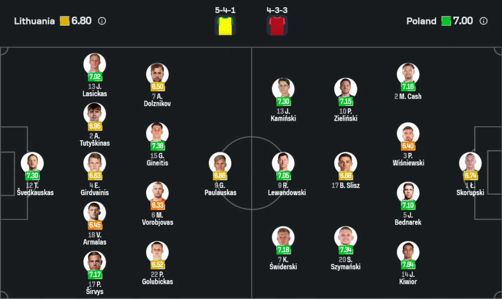 เอ็ดการาส ยานเคาสคาส กุนซือเจ้าถิ่นเตรียมสู้ด้วยแผน 5-4-1 หวังใช้กำแพงแนวรับที่แน่นหนาป้องกันเกมรุกโปแลนด์ที่ขึ้นชื่อเรื่องจังหวะเข้าทำเร็ว แผงหลัง 5 คนมี อาร์มาลาส เป็นผู้นำแนวรับ ขนาบด้วยแบ็กสองฝั่งอย่าง สเวดคาสคาส และ ลาซิชกาส ส่วนแดนกลางจะมี กวิดาส กิเนติส ห้องเครื่องจากโตริโน่ เป็นจอมขับเคลื่อนเกมโดยมี โมเดสตาส โวโรบยอฟ คอยซ้อนต่ำช่วยเกมรับอีกแรง ขณะที่หัวหอกความหวังของทีมคือ กีติส เปาลาอุสคาส ที่ต้องรับบทบาทเป้าสลายเกมแนวรับโปแลนด์เพียงลำพัง